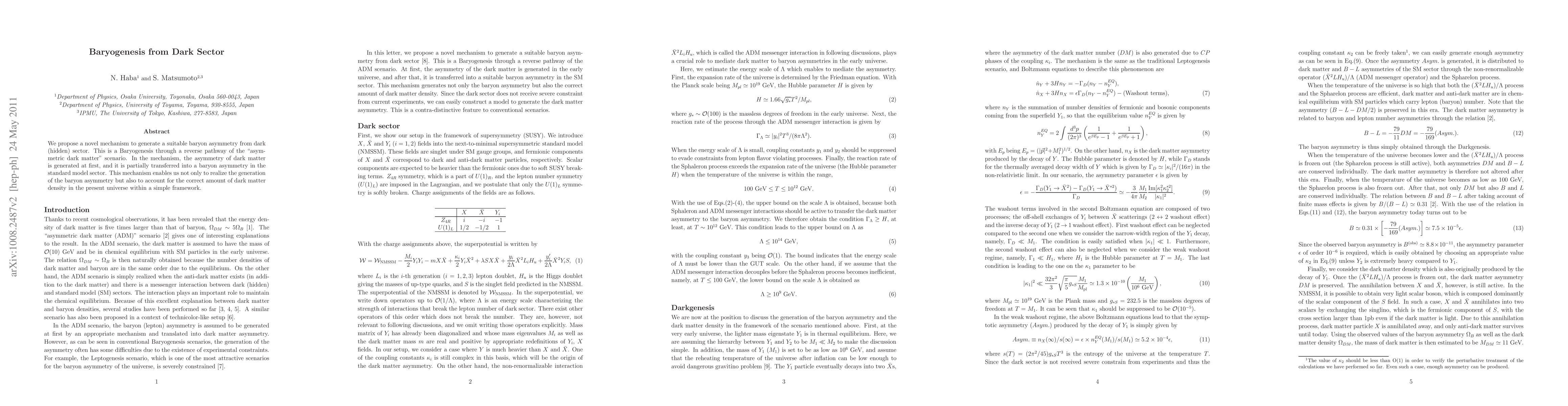 We propose a novel mechanism to generate a suitable baryon asymmetry from dark (hidden) sector. This is a Baryogenesis through a reverse pathway of the "asymmetric dark matter" scenario. In the mechanism, the asymmetry of dark matter is generated at first, and it is partially transferred into a baryon asymmetry in the standard model sector. This mechanism enables us not only to realize the generation of the baryon asymmetry but also to account for the correct amount of dark matter density in the present universe within a simple framework.