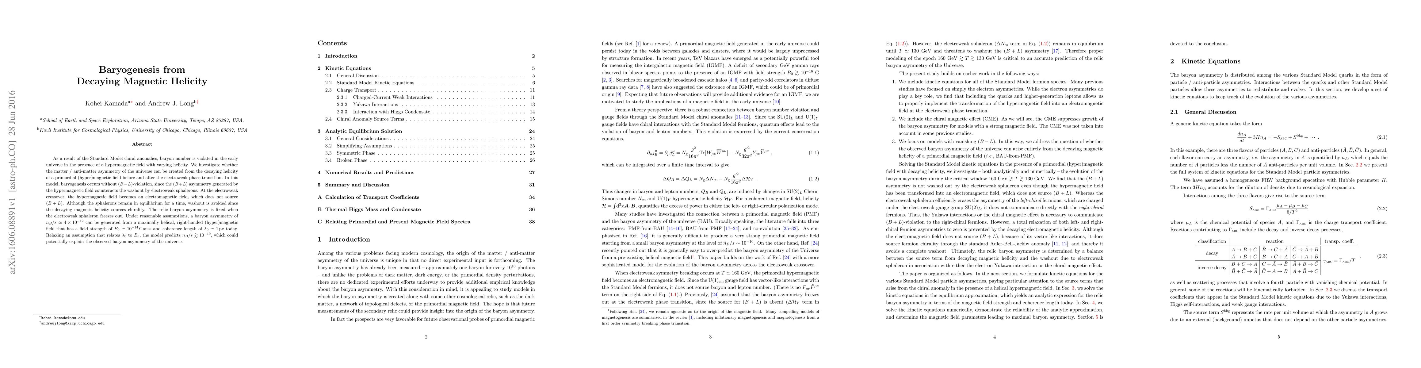 This paper explores the possibility of generating the universe's matter/anti-matter asymmetry through the decay of a primordial hypermagnetic field's helicity, avoiding $(B-L)$-violation. It predicts a baryon asymmetry of $n_B / s \simeq 4 \times 10^{-12}$ under specific conditions, potentially explaining the observed baryon asymmetry.