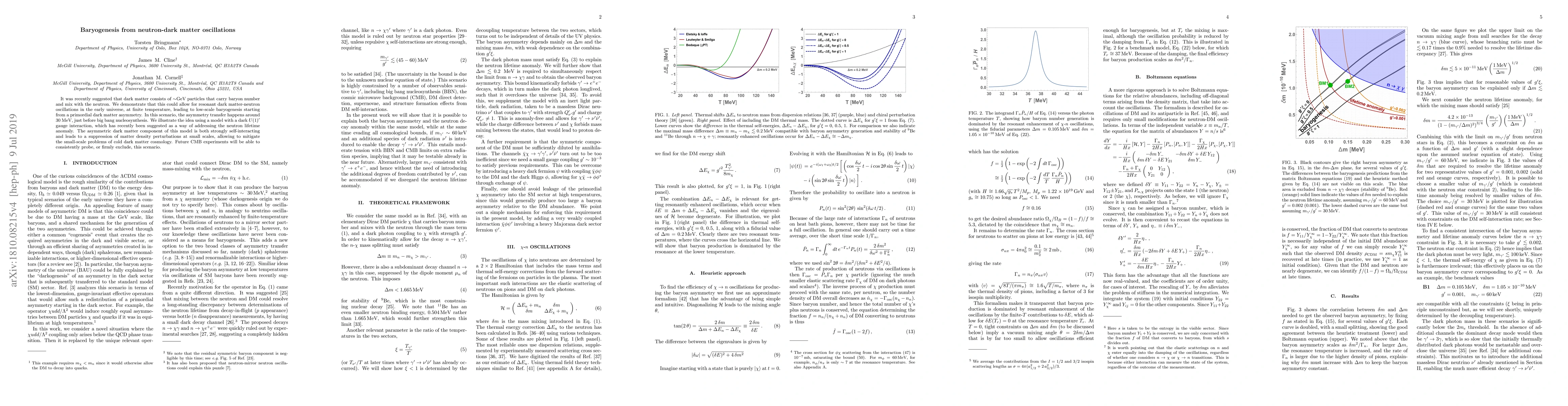 This paper proposes a mechanism for baryogenesis through resonant oscillations between neutrons and dark matter particles in the early universe, driven by a dark U(1)' gauge interaction. It suggests that this could resolve small-scale structure issues in cold dark matter cosmology and could be tested by future CMB experiments.
