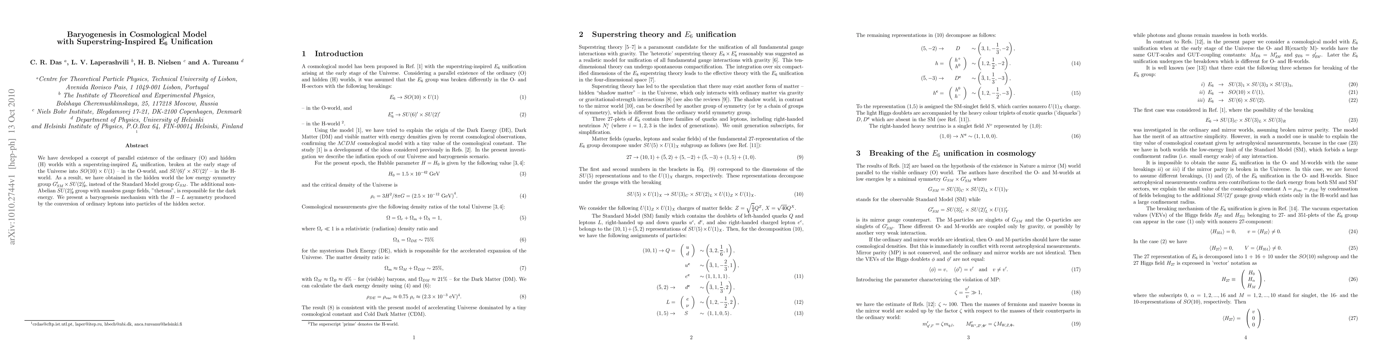 We have developed a concept of parallel existence of the ordinary (O) and hidden (H) worlds with a superstring-inspired E_6 unification, broken at the early stage of the Universe into SO(10) X U(1) - in the O-world, and SU(6)' X SU(2)' - in the H-world. As a result, we have obtained in the hidden world the low energy symmetry group G'_SM X SU(2)'_\theta, instead of the Standard Model group G_SM. The additional non-Abelian SU(2)'_\theta group with massless gauge fields, "thetons", is responsible for the dark energy. We present a baryogenesis mechanism with the B-L asymmetry produced by the conversion of ordinary leptons into particles of the hidden sector.
