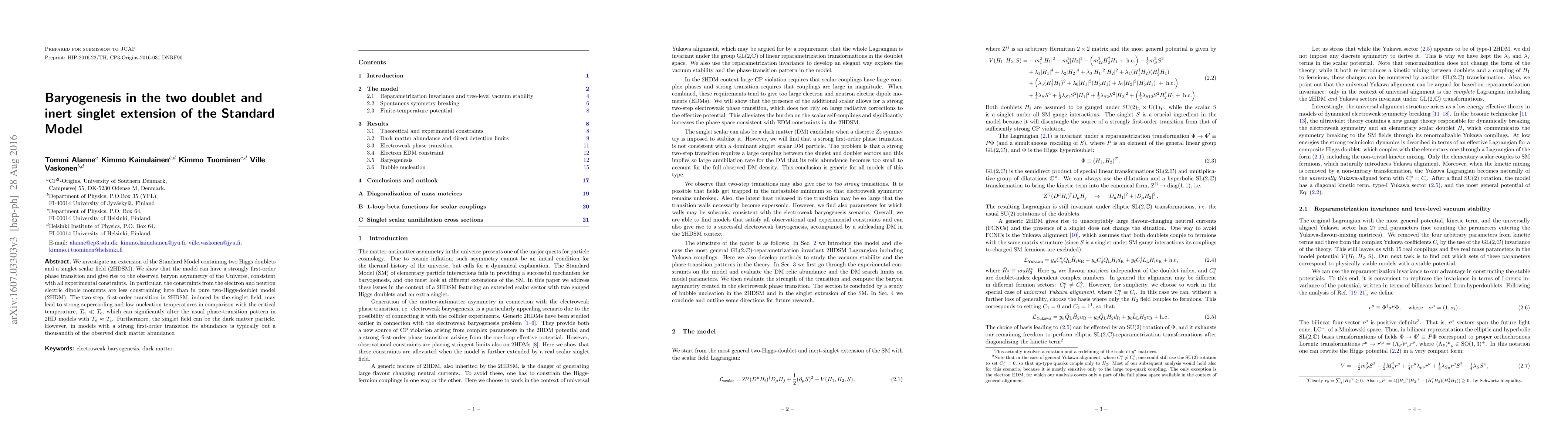We investigate an extension of the Standard Model containing two Higgs doublets and a singlet scalar field (2HDSM). We show that the model can have a strongly first-order phase transition and give rise to the observed baryon asymmetry of the Universe, consistent with all experimental constraints. In particular, the constraints from the electron and neutron electric dipole moments are less constraining here than in pure two-Higgs-doublet model (2HDM). The two-step, first-order transition in 2HDSM, induced by the singlet field, may lead to strong supercooling and low nucleation temperatures in comparison with the critical temperature, $T_n \ll T_c$, which can significantly alter the usual phase-transition pattern in 2HD models with $T_n \approx T_c$. Furthermore, the singlet field can be the dark matter particle. However, in models with a strong first-order transition its abundance is typically but a thousandth of the observed dark matter abundance.