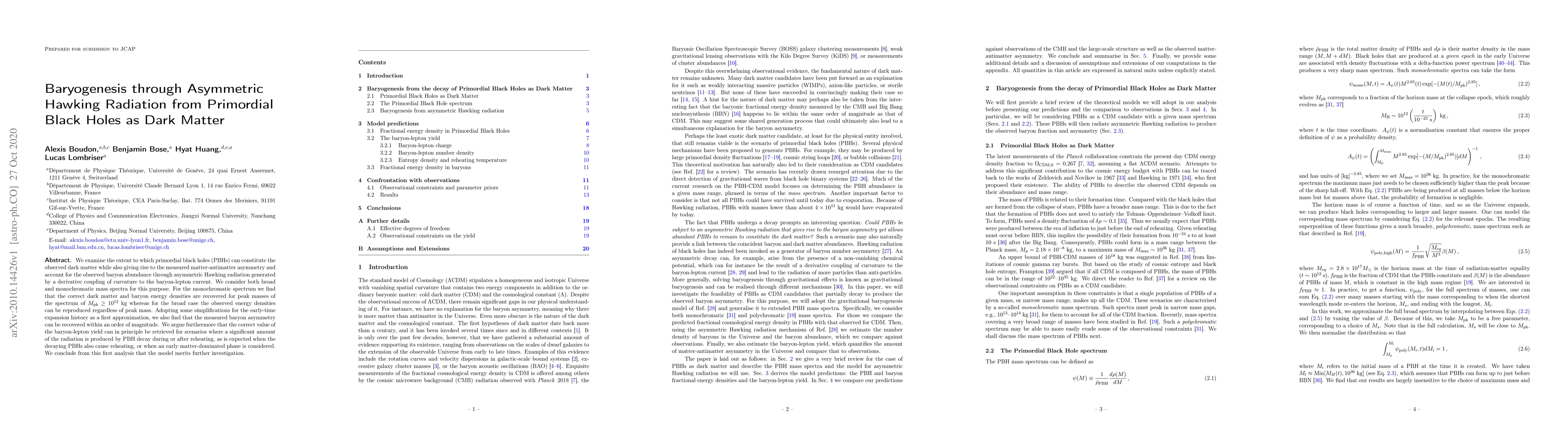 We examine the extent to which primordial black holes (PBHs) can constitute the observed dark matter while also giving rise to the measured matter-antimatter asymmetry and account for the observed baryon abundance through asymmetric Hawking radiation generated by a derivative coupling of curvature to the baryon-lepton current. We consider both broad and monochromatic mass spectra for this purpose. For the monochromatic spectrum we find that the correct dark matter and baryon energy densities are recovered for peak masses of the spectrum of $M_{\rm pk} \geq 10^{12}$ kg whereas for the broad case the observed energy densities can be reproduced regardless of peak mass. Adopting some simplifications for the early-time expansion history as a first approximation, we also find that the measured baryon asymmetry can be recovered within an order of magnitude. We argue furthermore that the correct value of the baryon-lepton yield can in principle be retrieved for scenarios where a significant amount of the radiation is produced by PBH decay during or after reheating, as is expected when the decaying PBHs also cause reheating, or when an early matter-dominated phase is considered. We conclude from this first analysis that the model merits further investigation.