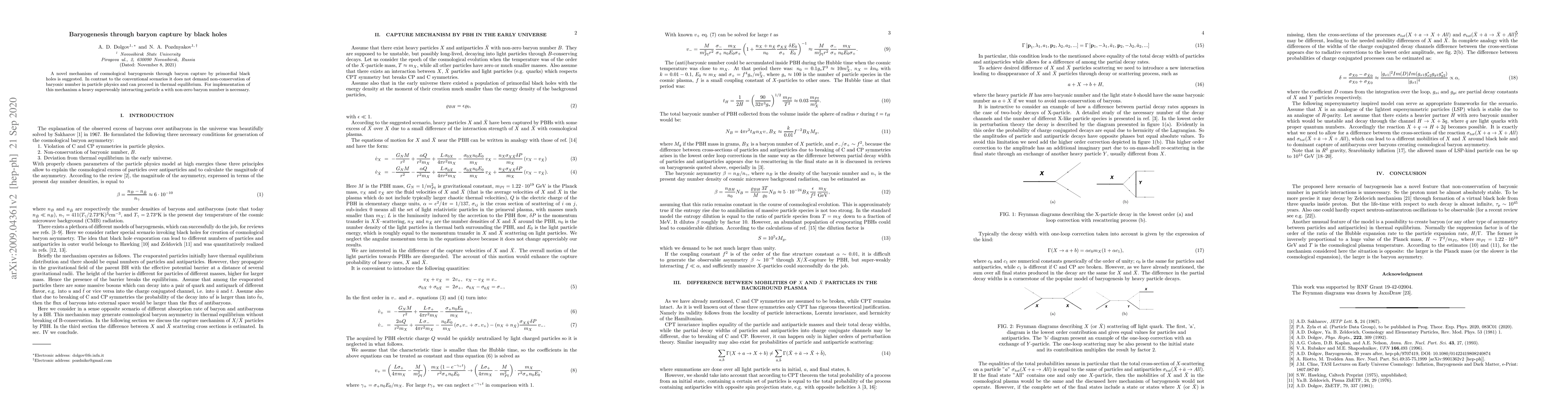 The paper introduces a novel mechanism of baryogenesis through baryon capture by primordial black holes, which proceeds in thermal equilibrium without requiring non-conservation of baryonic number in particle physics.