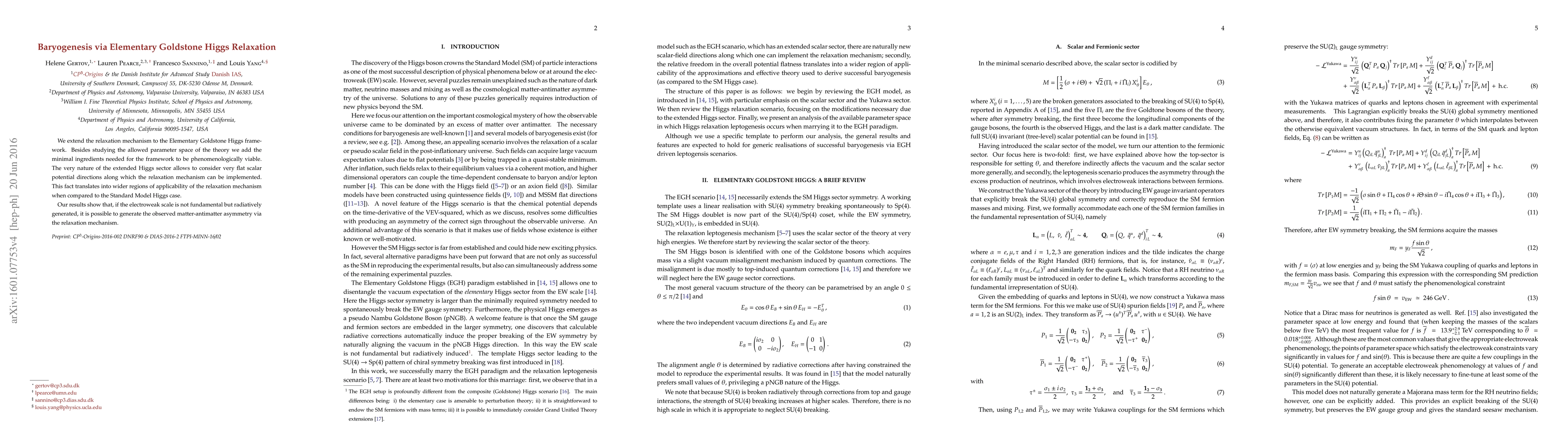 We extend the relaxation mechanism to the Elementary Goldstone Higgs framework. Besides studying the allowed parameter space of the theory we add the minimal ingredients needed for the framework to be phenomenologically viable. The very nature of the extended Higgs sector allows to consider very flat scalar potential directions along which the relaxation mechanism can be implemented. This fact translates into wider regions of applicability of the relaxation mechanism when compared to the Standard Model Higgs case. Our results show that, if the electroweak scale is not fundamental but radiatively generated, it is possible to generate the observed matter-antimatter asymmetry via the relaxation mechanism.