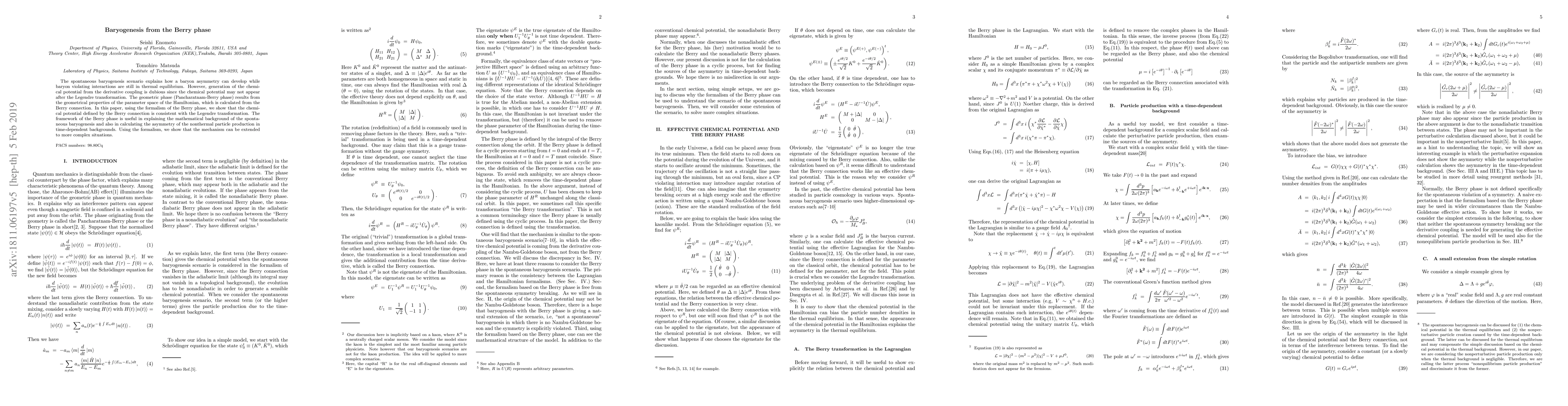 The spontaneous baryogenesis scenario explains how a baryon asymmetry can develop while baryon violating interactions are still in thermal equilibrium. However, generation of the chemical potential from the derivative coupling is dubious since the chemical potential may not appear after the Legendre transformation. The geometric phase (Pancharatnam-Berry phase) results from the geometrical properties of the parameter space of the Hamiltonian, which is calculated from the Berry connection. In this paper, using the formalism of the Berry phase, we show that the chemical potential defined by the Berry connection is consistent with the Legendre transformation. The framework of the Berry phase is useful in explaining the mathematical background of the spontaneous baryogenesis, and also is useful for calculating the asymmetry of the non-thermal particle production in time-dependent backgrounds. Using the formalism, we show that the mechanism can be extended to more complex situations.