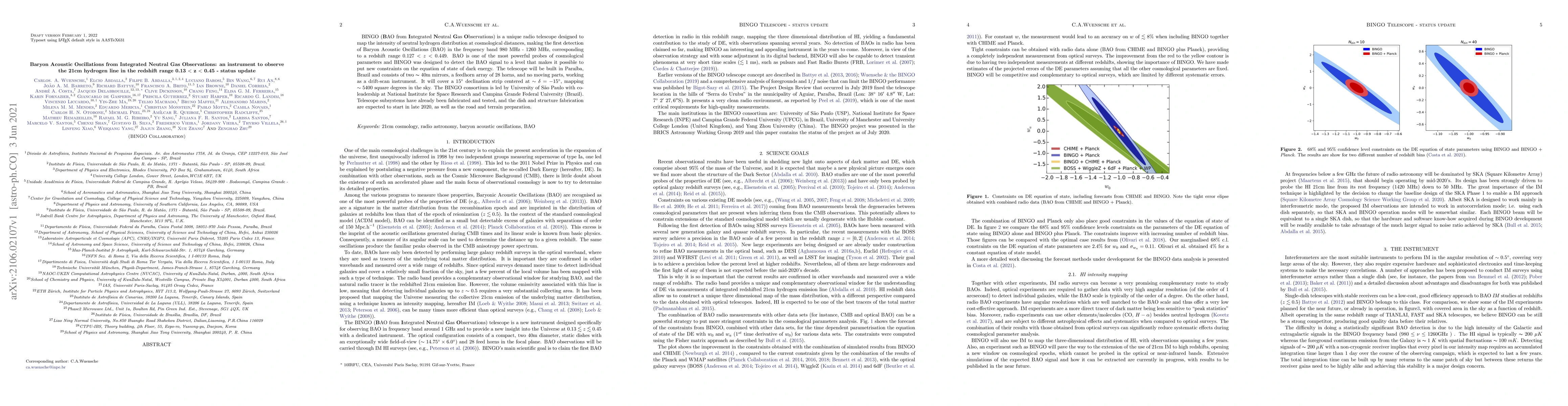 BINGO (BAO from Integrated Neutral Gas Observations) is a unique radio telescope designed to map the intensity of neutral hydrogen distribution at cosmological distances, making the first detection of Baryon Acoustic Oscillations (BAO) in the frequency band 980 MHz - 1260 MHz, corresponding to a redshift range $0.127 < z < 0.449$. BAO is one of the most powerful probes of cosmological parameters and BINGO was designed to detect the BAO signal to a level that makes it possible to put new constraints on the equation of state of dark energy. The telescope will be built in Para\'iba, Brazil and consists of two $\thicksim$ 40m mirrors, a feedhorn array of 28 horns, and no moving parts, working as a drift-scan instrument. It will cover a $15^{\circ}$ declination strip centered at $\sim \delta=-15^{\circ}$, mapping $\sim 5400$ square degrees in the sky. The BINGO consortium is led by University of S\~ao Paulo with co-leadership at National Institute for Space Research and Campina Grande Federal University (Brazil). Telescope subsystems have already been fabricated and tested, and the dish and structure fabrication are expected to start in late 2020, as well as the road and terrain preparation.