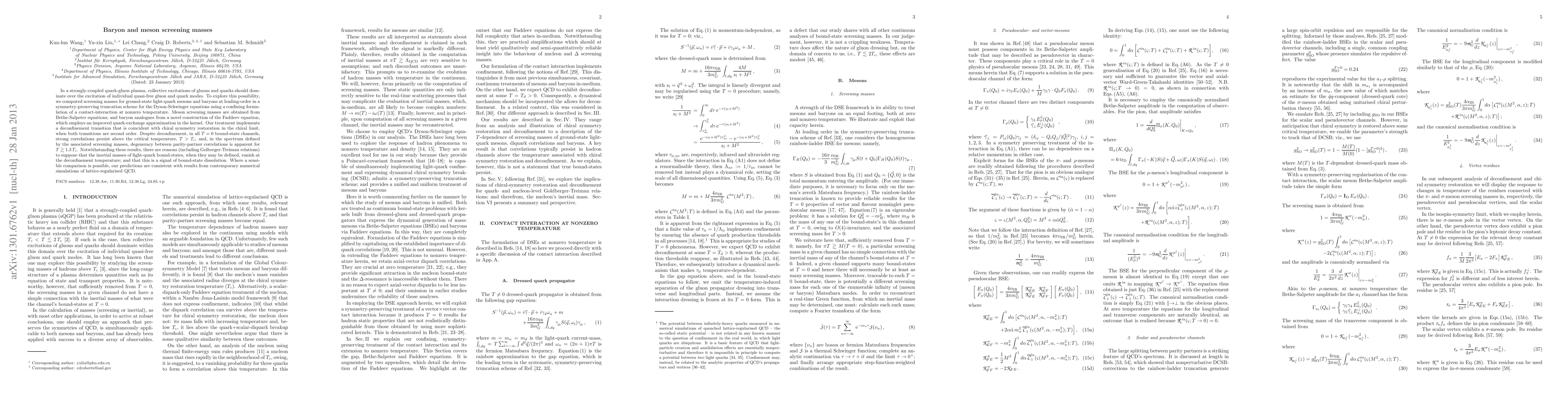 In a strongly-coupled quark-gluon plasma, collective excitations of gluons and quarks should dominate over the excitation of individual quasi-free gluon and quark modes. To explore this possibility, we computed screening masses for ground-state light-quark mesons and baryons at leading-order in a symmetry-preserving truncation scheme for the Dyson-Schwinger equations using a confining formulation of a contact-interaction at nonzero temperature. Meson screening masses are obtained from Bethe-Salpeter equations; and baryon analogues from a novel construction of the Faddeev equation, which employs an improved quark-exchange approximation in the kernel. Our treatment implements a deconfinement transition that is coincident with chiral symmetry restoration in the chiral limit, when both transitions are second order. Despite deconfinement, in all T=0 bound-state channels, strong correlations persist above the critical temperature, T>T_c; and, in the spectrum defined by the associated screening masses, degeneracy between parity-partner correlations is apparent for T >1.3T_c. Notwithstanding these results, there are reasons (including Golberger-Treiman relations) to suppose that the inertial masses of light-quark bound-states, when they may be defined, vanish at the deconfinement temperature; and that this is a signal of bound-state dissolution. Where a sensible comparison is possible, our predictions are consistent with results from contemporary numerical simulations of lattice-regularised QCD.