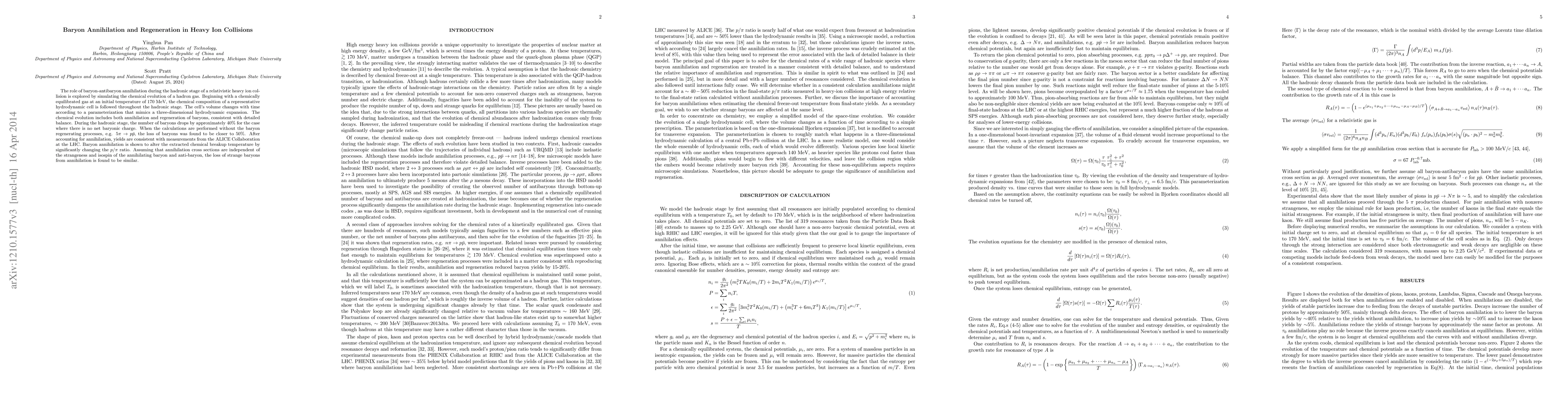 The role of baryon-antibaryon annihilation during the hadronic stage of a relativistic heavy ion collision is explored by simulating the chemical evolution of a hadron gas. Beginning with a chemically equilibrated gas at an initial temperature of 170 MeV, the chemical composition of a representative hydrodynamic cell is followed throughout the hadronic stage. The cell's volume changes with time according to a parameterization that mimics a three-dimensional hydrodynamic expansion. The chemical evolution includes both annihilation and regeneration of baryons, consistent with detailed balance. During the hadronic stage, the number of baryons drops by approximately $40\%$ for the case where there is no net baryonic charge. When the calculations are performed without the baryon regenerating processes, e.g. $5\pi\rightarrow p\bar{p}$, the loss of baryons was found to be closer to $50\%$. After accounting for annihilation, yields are consistent with measurements from the ALICE Collaboration at the LHC. Baryon annihilation is shown to alter the extracted chemical breakup temperature by significantly changing the $p/\pi$ ratio. Assuming that annihilation cross sections are independent of the strangeness and isospin of the annihilating baryon and anti-baryon, the loss of strange baryons from annihilation is found to be similar.