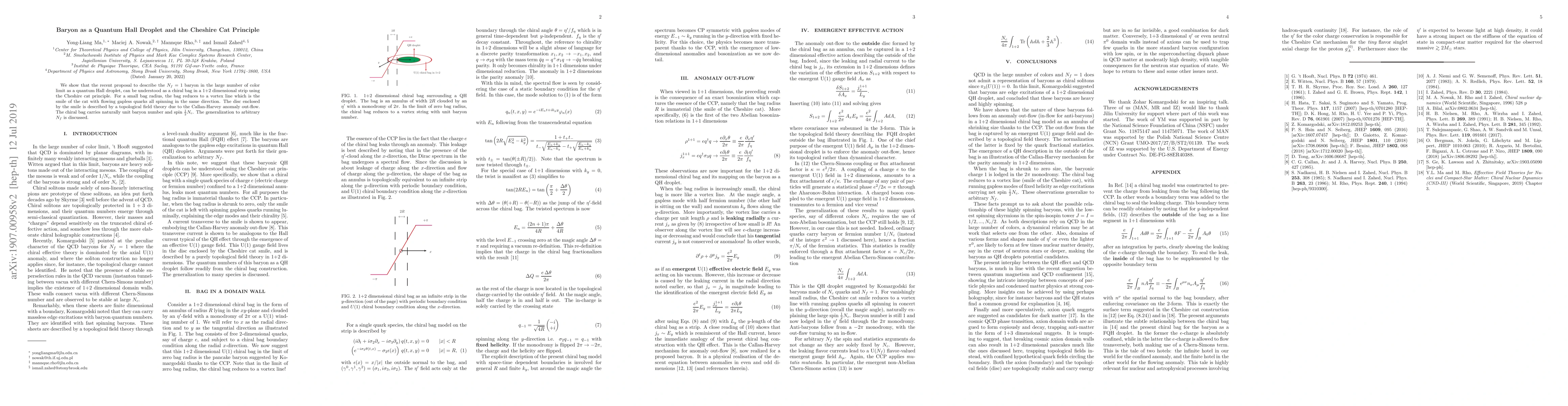 We show that the recent proposal to describe the $N_f=1$ baryon in the large number of color limit as a quantum Hall droplet, can be understood as a chiral bag in a 1+2 dimensional strip using the Cheshire cat principle. For a small bag radius, the bag reduces to a vortex line which is the smile of the cat with flowing gapless quarks all spinning in the same direction. The disc enclosed by the smile is described by a topological field theory due to the Callan-Harvey anomaly out-flow. The chiral bag carries naturally unit baryon number and spin $\frac 12 N_c$. The generalization to arbitrary $N_f$ is discussed.