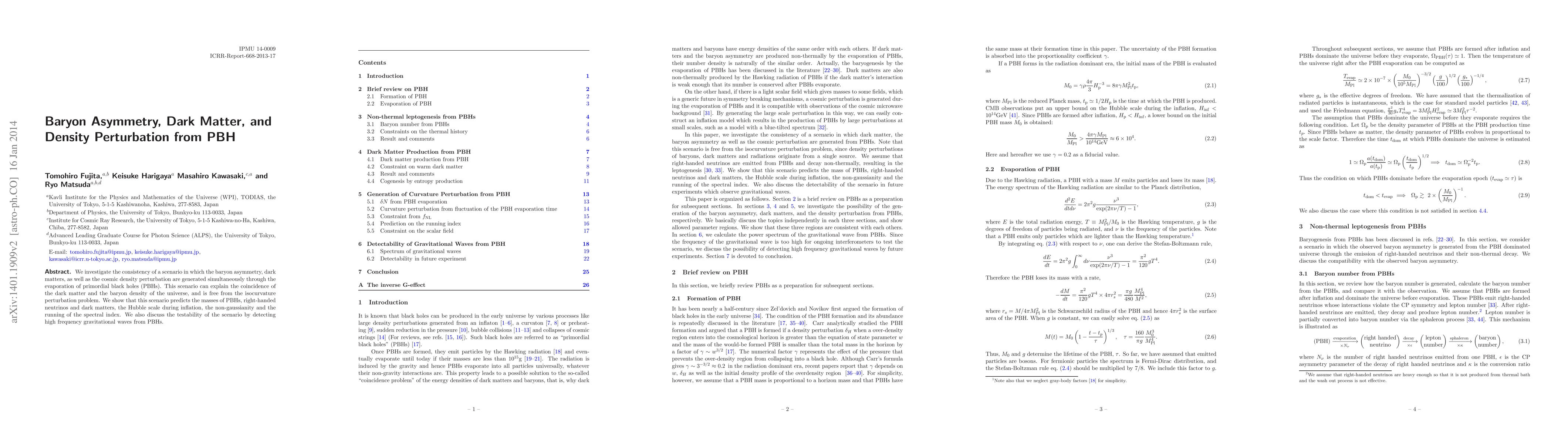 This paper explores a model where primordial black holes (PBHs) evaporate to generate baryon asymmetry, dark matter, and cosmic density perturbations, addressing the coincidence problem between dark and baryonic matter. It predicts specific PBH masses, right-handed neutrino properties, and inflationary parameters, and suggests high-frequency gravitational waves as a testable prediction.