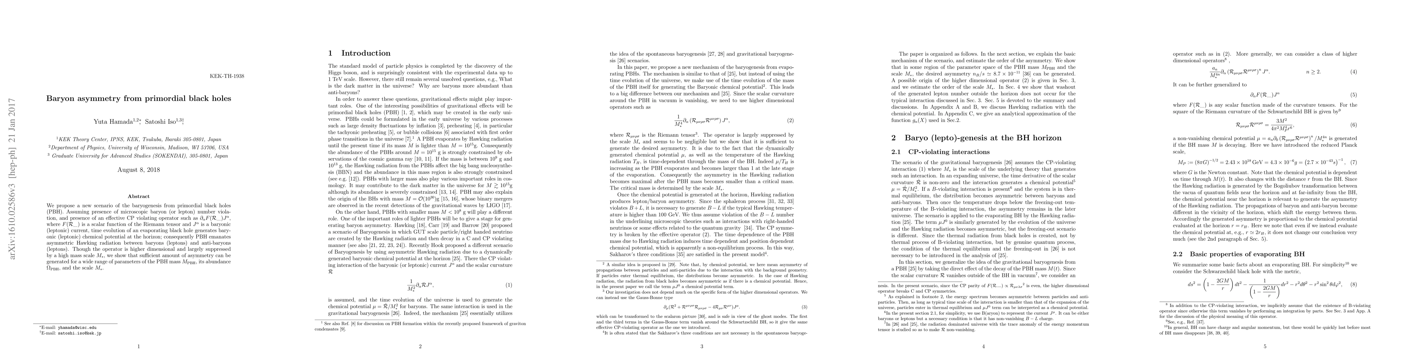 This research proposes a novel baryogenesis scenario from primordial black holes (PBH), suggesting that a CP-violating operator generates a baryonic chemical potential at the horizon during black hole evaporation, leading to asymmetric Hawking radiation. Despite higher-dimensional suppression, the model can produce significant baryon asymmetry for a broad range of PBH mass, abundance, and scale parameters.