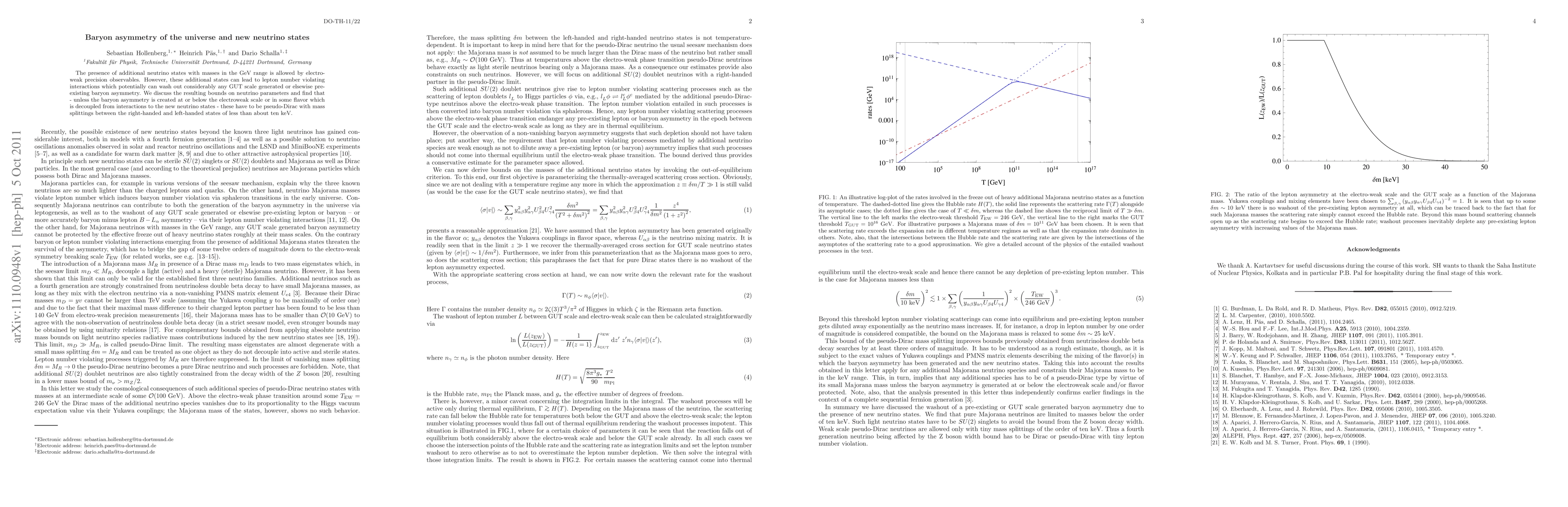 The presence of additional neutrino states with masses in the GeV range is allowed by electro-weak precision observables. However, these additional states can lead to lepton number violating interactions which potentially can wash out considerably any GUT scale generated or elsewise pre-existing baryon asymmetry. We discuss the resulting bounds on neutrino parameters and find that - unless the baryon asymmetry is created at or below the electroweak scale or in some flavor which is decoupled from interactions to the new neutrino states - these have to be pseudo-Dirac with mass splittings between the right-handed and left-handed states of less than about ten keV.