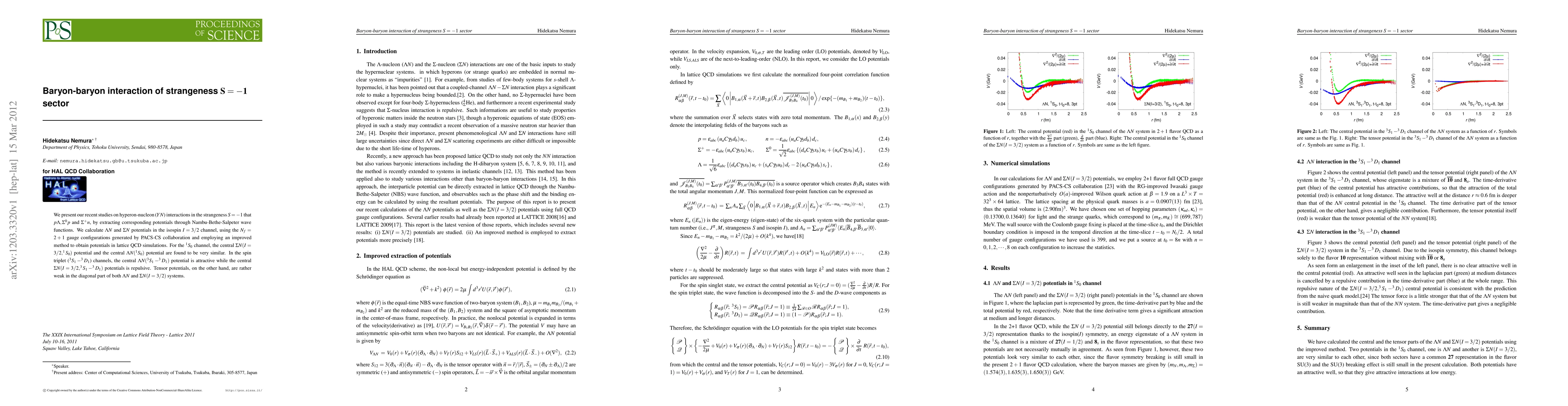 We present our recent studies on hyperon-nucleon (YN) interactions in the strangeness S=-1 that $p\Lambda, \Sigma^0 p$ and $\Sigma^+ n$, by extracting corresponding potentials through Nambu-Bethe-Salpeter wave functions. We calculate $\Lambda N$ and $\Sigma N$ potentials in the isospin I=3/2 channel, using the $N_f=2+1$ gauge configurations generated by PACS-CS collaboration and employing an improved method to obtain potentials in lattice QCD simulations. For the $^1S_0$ channel, the central $\Sigma N (I=3/2, ^1S_0)$ potential and the central $\Lambda N (^1S_0)$ potential are found to be very similar. In the spin triplet ($^3S_1-^3D_1$) channels, the central $\Lambda N(^3S_1-^3D_1)$ potential is attractive while the central $\Sigma N(I=3/2, ^3S_1-^3D_1)$ potentials is repulsive. Tensor potentials, on the other hand, are rather weak in the diagonal part of both $\Lambda N$ and $\Sigma N(I=3/2)$ systems.