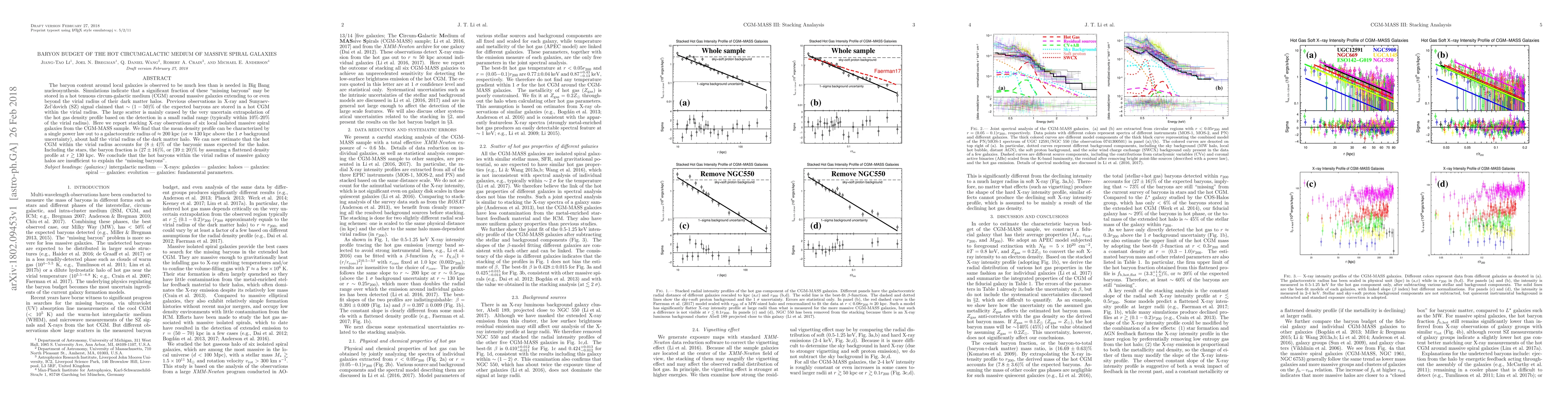 This paper reports on X-ray observations of the hot circumgalactic medium (CGM) around six massive spiral galaxies, finding that the CGM within the virial radius accounts for $(8\pm4)\%$ of the expected baryonic mass. The study concludes that the hot baryons within the virial radius are insufficient to explain the "missing baryons" observed in Big Bang nucleosynthesis.