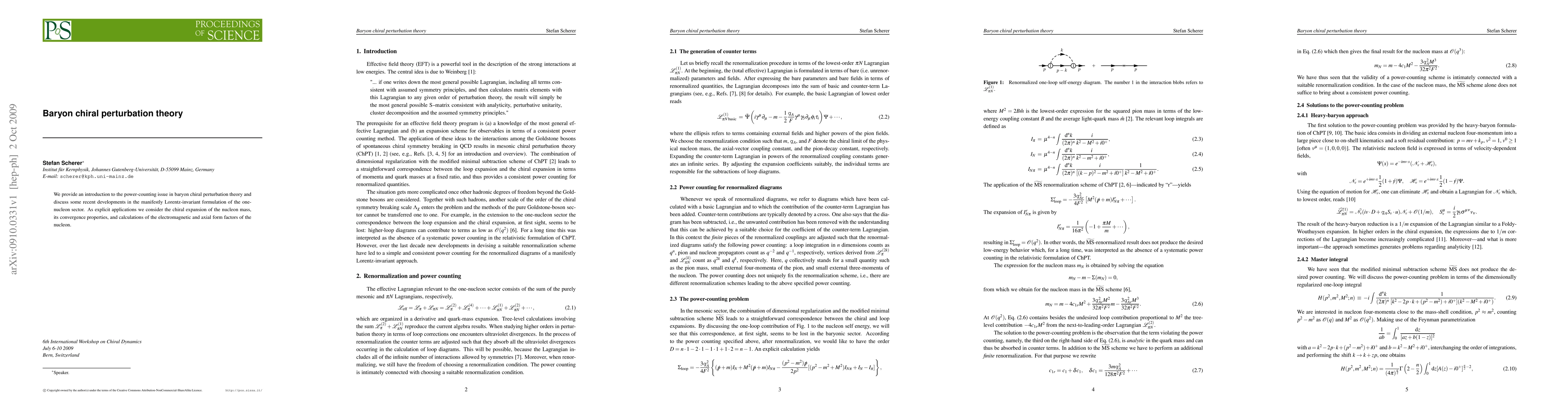 This paper introduces baryon chiral perturbation theory, focusing on the power-counting issue and recent advancements in its Lorentz-invariant formulation. It also examines the nucleon mass's chiral expansion, convergence properties, and computes electromagnetic and axial form factors.