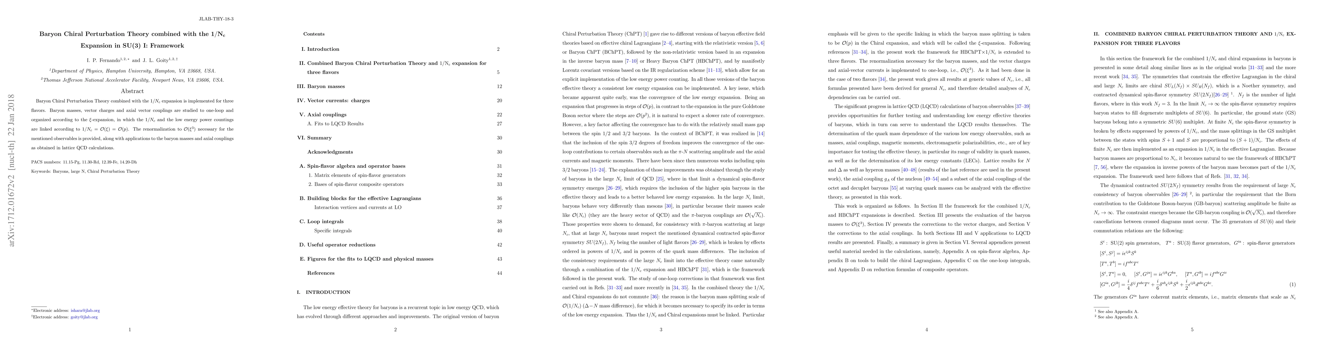 Baryon Chiral Perturbation Theory combined with the $1/N_c$ expansion is implemented for three flavors. Baryon masses, vector charges and axial vector couplings are studied to one-loop and organized according to the $\xi$-expansion, in which the $1/N_c$ and the low energy power countings are linked according to $1/N_c={\cal{O}}(\xi)={\cal{O}}(p)$. The renormalization to ${\cal{O}}(\xi^3)$ necessary for the mentioned observables is provided, along with applications to the baryon masses and axial couplings as obtained in lattice QCD calculations.