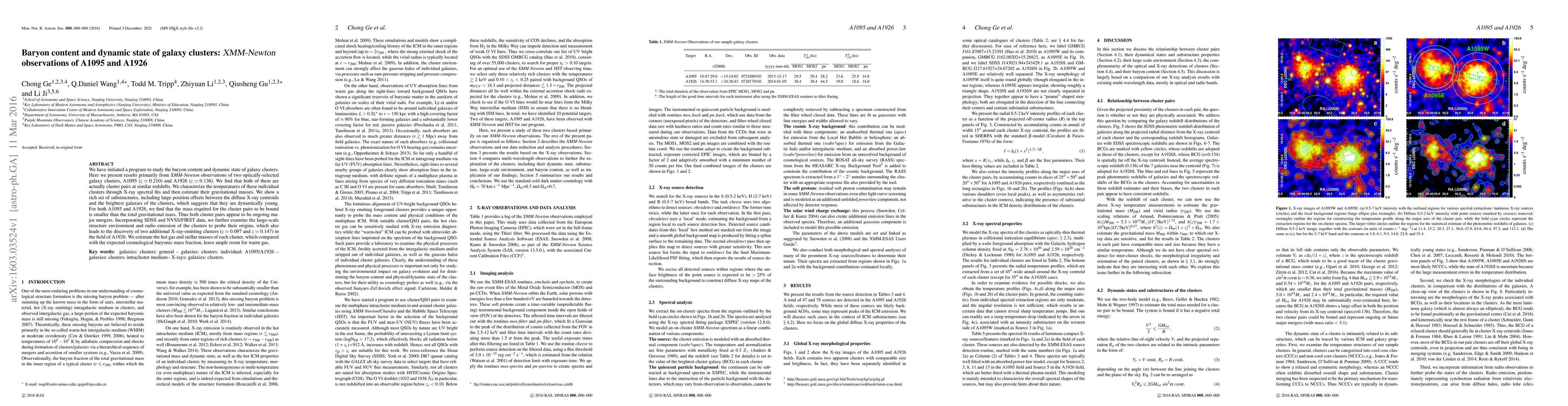 We have initiated a program to study the baryon content and dynamic state of galaxy clusters. Here we present results primarily from XMM-Newton observations of two optically-selected galaxy clusters, A1095 ($z \simeq 0.210$) and A1926 ($z \simeq 0.136$). We find that both of them are actually cluster pairs at similar redshifts. We characterize the temperatures of these individual clusters through X-ray spectral fits and then estimate their gravitational masses. We show a rich set of substructures, including large position offsets between the diffuse X-ray centroids and the brightest galaxies of the clusters, which suggests that they are dynamically young. For both A1095 and A1926, we find that the mass required for the cluster pairs to be bound is smaller than the total gravitational mass. Thus both cluster pairs appear to be ongoing major mergers. Incorporating SDSS and NVSS/FIRST data, we further examine the large-scale structure environment and radio emission of the clusters to probe their origins, which also leads to the discovery of two additional X-ray-emitting clusters ($z \simeq 0.097$ and $z \simeq 0.147$) in the field of A1926. We estimate the hot gas and stellar masses of each cluster, which compared with the expected cosmological baryonic mass fraction, leave ample room for warm gas.
