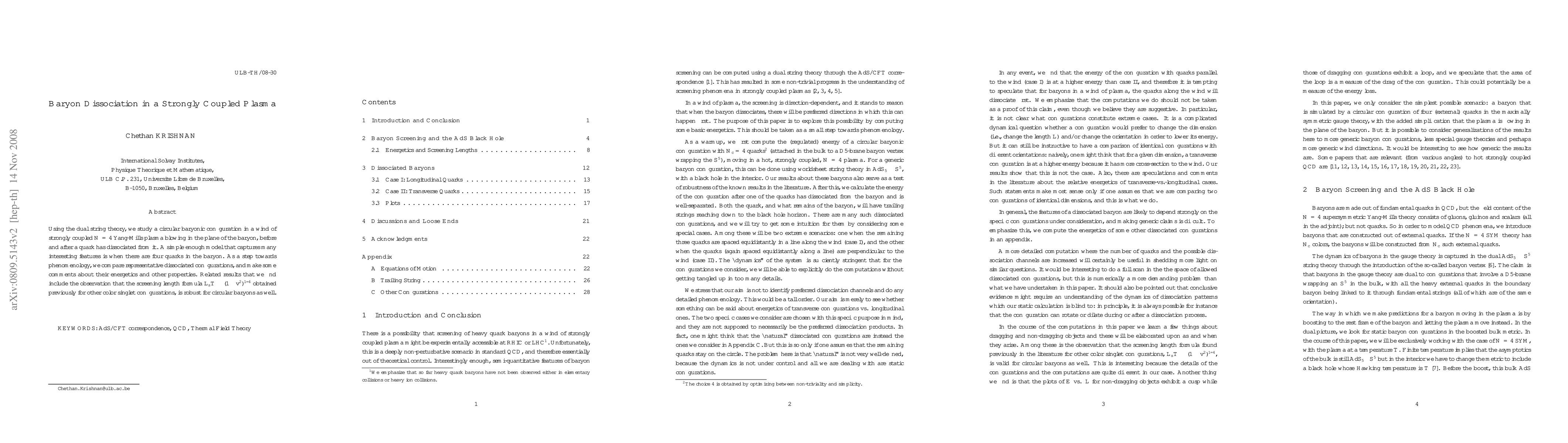 Using the dual string theory, we study a circular baryonic configuration in a wind of strongly coupled N=4 Yang-Mills plasma blowing in the plane of the baryon, before and after a quark has dissociated from it. A simple enough model that captures many interesting features is when there are four quarks in the baryon. As a step towards phenomenology, we compare representative dissociated configurations, and make some comments about their energetics and other properties. Related results that we find include the observation that the screening length formula L_s T ~ (1-v^2)^{1/4} obtained previously for other color singlet configurations, is robust for circular baryons as well.