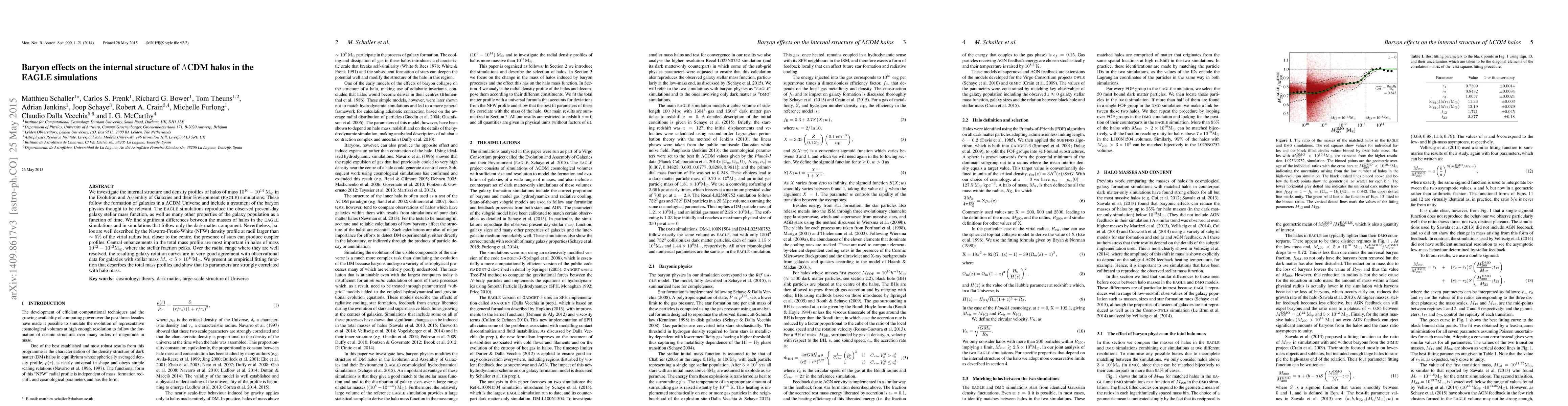 This paper examines the internal structure of LCDM halos in the EAGLE simulations, finding significant baryon effects that alter density profiles, especially in halos of mass $10^{12}-10^{13}~M_\odot$. The study shows that while the NFW profile fits well at larger radii, baryonic matter leads to cuspier profiles closer to the center, with good agreement between simulated and observed galaxy rotation curves.