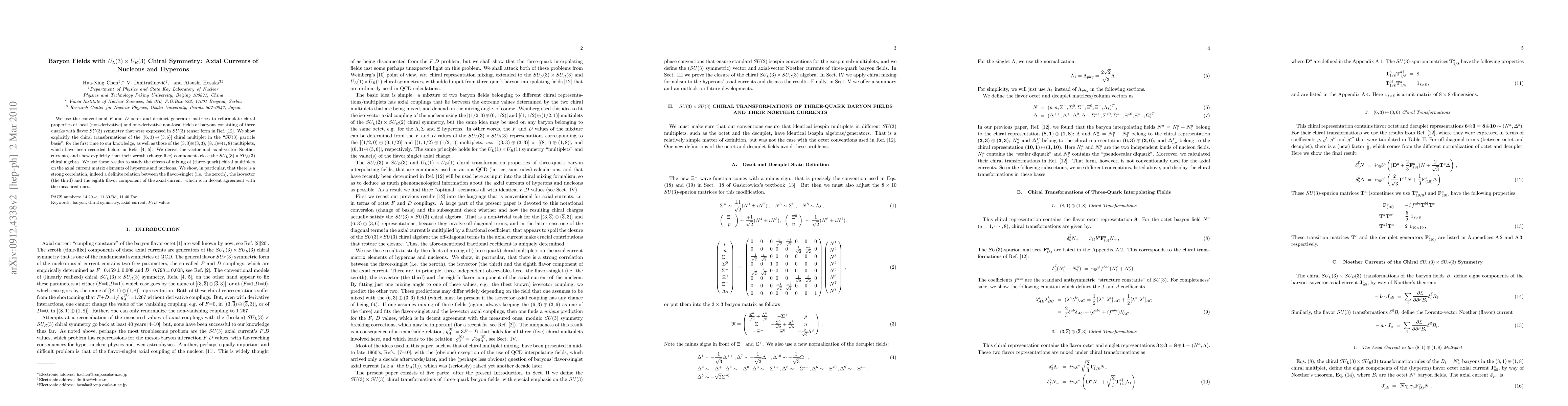 This paper reformulates chiral properties of baryon fields under U_L(3) × U_R(3) symmetry, deriving vector and axial-vector Noether currents. It explicitly demonstrates the chiral transformations of various chiral multiplets and shows a strong correlation between different components of the axial current, aligning well with experimental measurements.