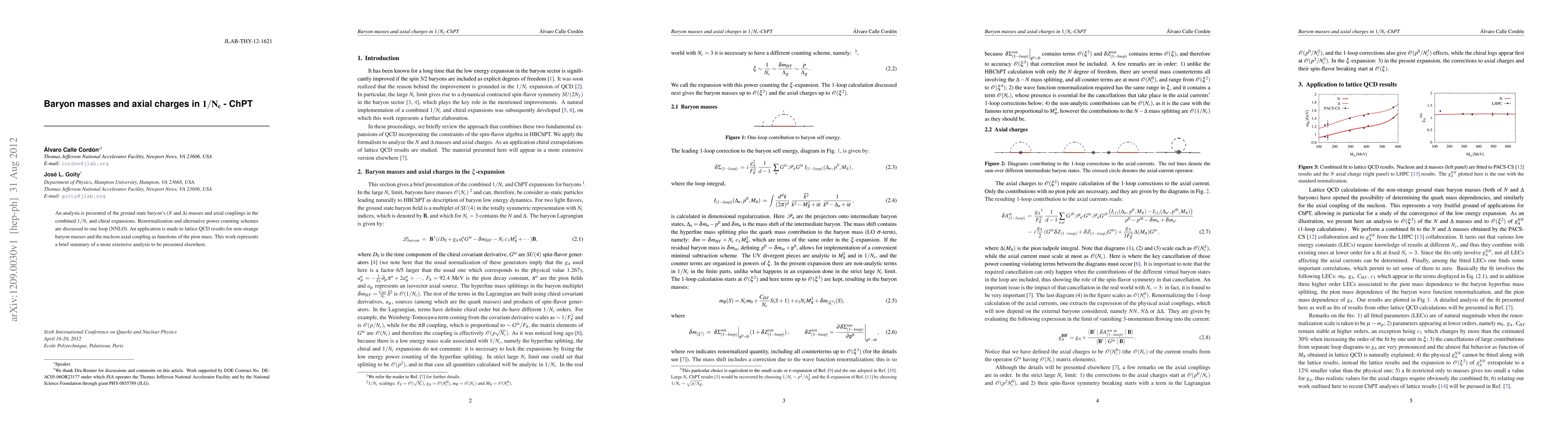 An analysis is presented of the ground state baryon's (N and \Delta) masses and axial couplings in the combined 1/Nc and chiral expansions. Renormalization and alternative power counting schemes are discussed to one loop (NNLO). An application is made to lattice QCD results for non-strange baryon masses and the nucleon axial coupling as functions of the pion mass. This work represents a brief summary of a more extensive analysis to be presented elsewhere.