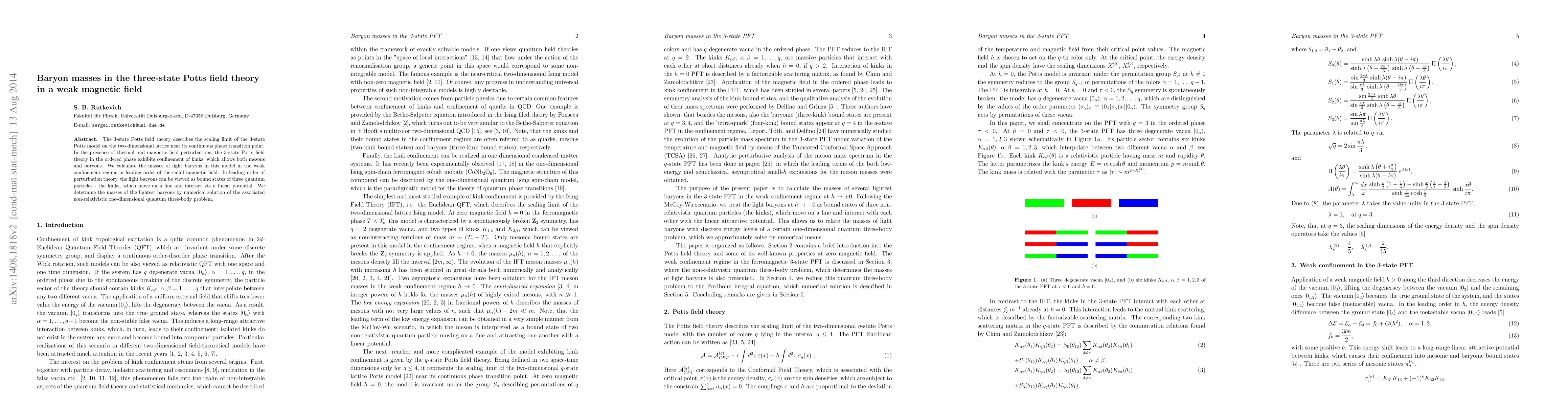 This paper calculates the masses of light baryons in the 3-state Potts field theory under weak magnetic fields, treating baryons as bound states of three kinks interacting via a linear potential. The masses are determined through a numerical solution of the non-relativistic one-dimensional quantum three-body problem.