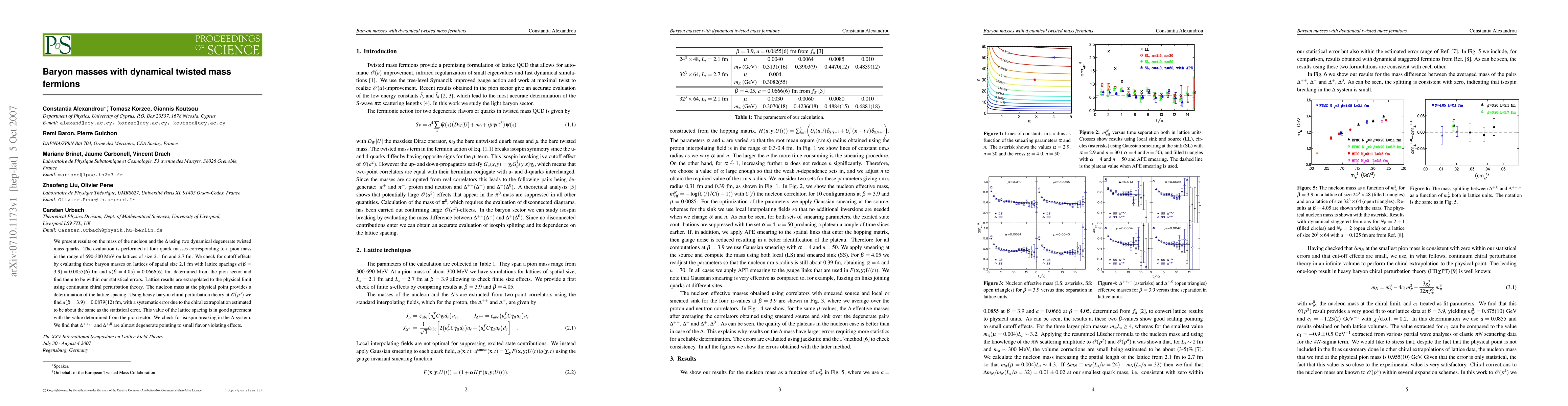 This study uses dynamical twisted mass fermions to determine nucleon and Delta baryon masses at various quark mass values, corresponding to pion mass range 690-300 MeV. Results are obtained on 2.1 fm and 2.7 fm lattices, with cutoff effects examined on 2.1 fm lattices. The nucleon mass at physical point defines lattice spacing, which is confirmed using chiral perturbation theory. Isospin breaking in Delta-system is also investigated, finding Delta^++/- and Delta^+0 nearly degenerate.