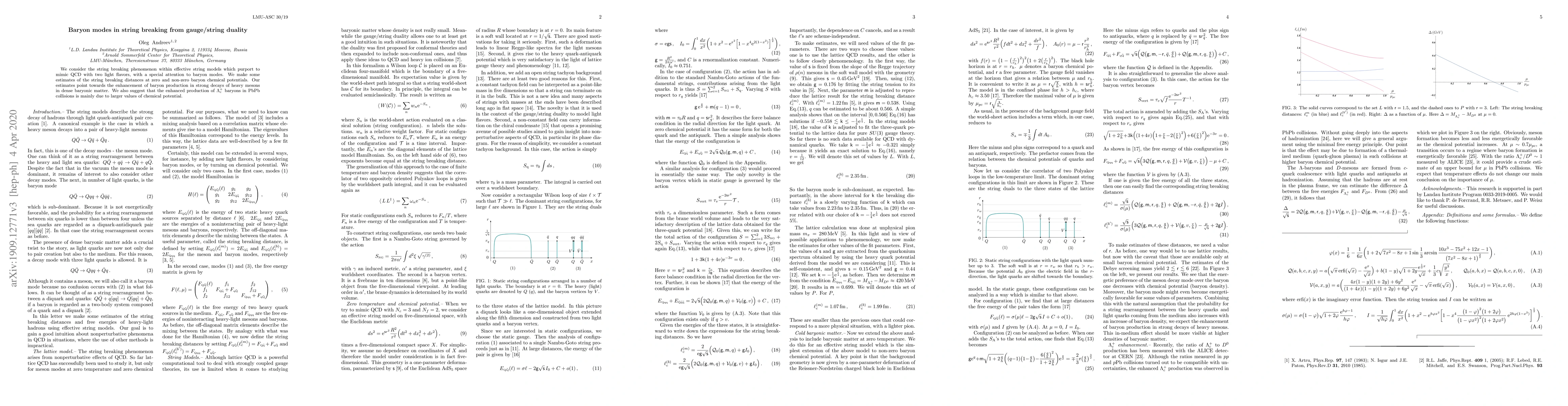 We consider the string breaking phenomenon within effective string models which purport to mimic QCD with two light flavors, with a special attention to baryon modes. We make some estimates of the string breaking distances at zero and non-zero baryon chemical potentials. Our estimates point towards the enhancement of baryon production in strong decays of heavy mesons in dense baryonic matter. We also suggest that the enhanced production of $\Lambda_c^+$ baryons in PbPb collisions is mainly due to larger values of chemical potential.
