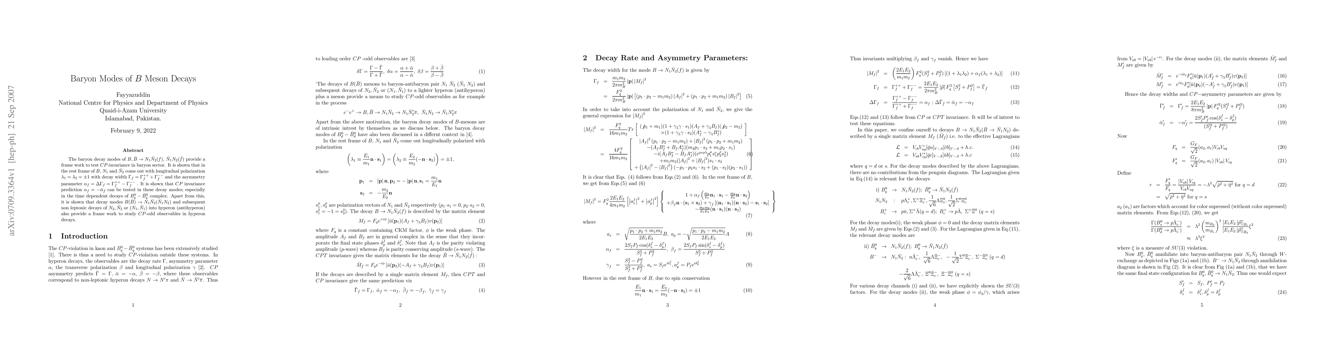This paper investigates baryon decay modes of B mesons to test CP-invariance, showing that CP prediction can be verified through the longitudinal polarization and asymmetry parameters in B meson decays. It also explores subsequent non-leptonic hyperon decays to study CP-odd observables.