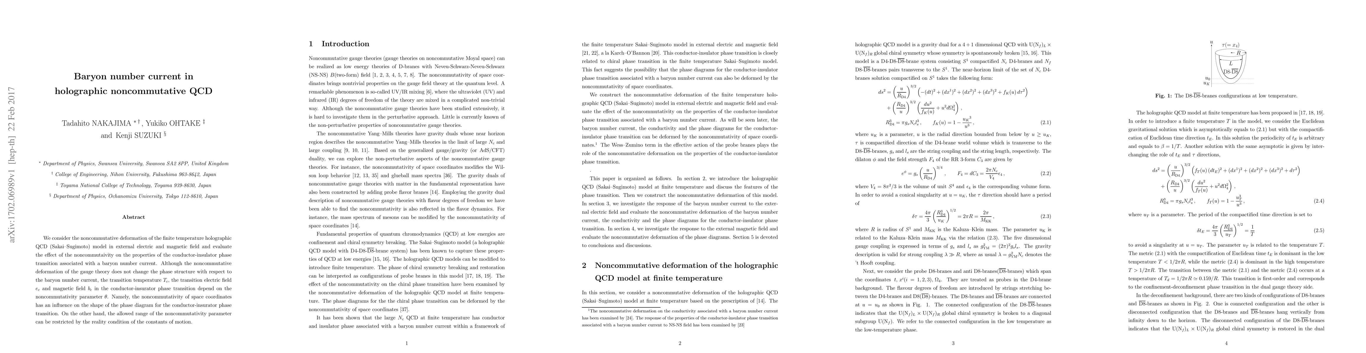 We consider the noncommutative deformation of the finite temperature holographic QCD (Sakai--Sugimoto) model in external electric and magnetic field and evaluate the effect of the noncommutaivity on the properties of the conductor-insulator phase transition associated with a baryon number current. Although the noncommutative deformation of the gauge theory does not change the phase structure with respect to the baryon number current, the transition temperature $T_{c}$, the transition electric field $e_{c}$ and magnetic field $b_{c}$ in the conductor-insurator phase transition depend on the noncommutativity parameter $\theta$. Namely, the noncommutativity of space coordinates has an influence on the shape of the phase diagram for the conductor-insurator phase transition. On the other hand, the allowed range of the noncommutativity parameter can be restricted by the reality condition of the constants of motion.