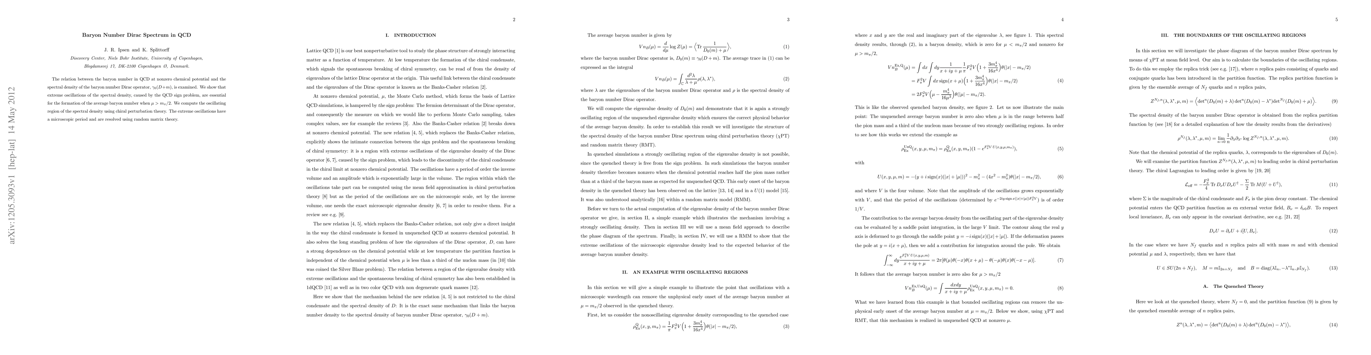 The paper presents a detailed analysis of the baryon number Dirac spectrum using chiral perturbation theory and random matrix theory, resolving the microscopic oscillations and linking them to the average baryon number density.