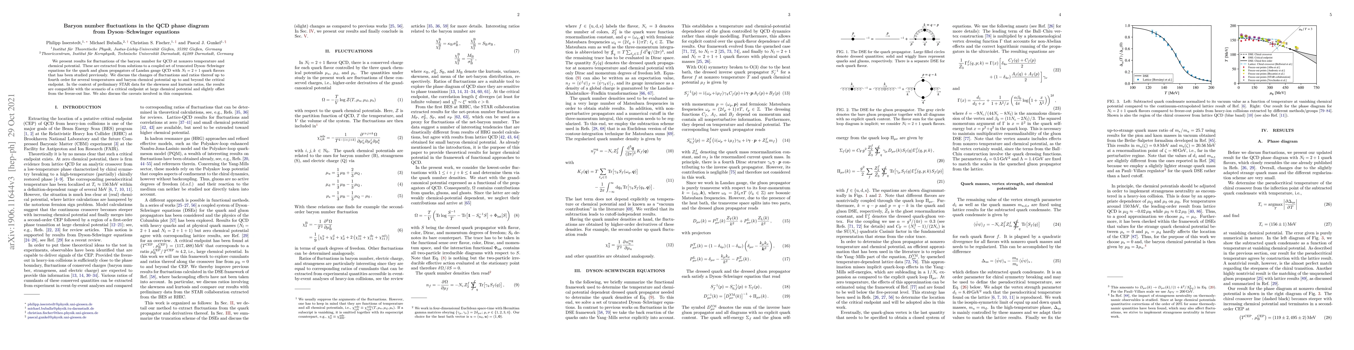 We present results for fluctuations of the baryon number for QCD at nonzero temperature and chemical potential. These are extracted from solutions to a coupled set of truncated Dyson-Schwinger equations for the quark and gluon propagators of Landau-gauge QCD with $N_f = 2 + 1$ quark flavors, that has been studied previously. We discuss the changes of fluctuations and ratios thereof up to fourth order for several temperatures and baryon chemical potential up to and beyond the critical endpoint. In the context of preliminary STAR data for the skewness and kurtosis ratios, the results are compatible with the scenario of a critical endpoint at large chemical potential and slightly offset from the freeze-out line. We also discuss the caveats involved in this comparison.