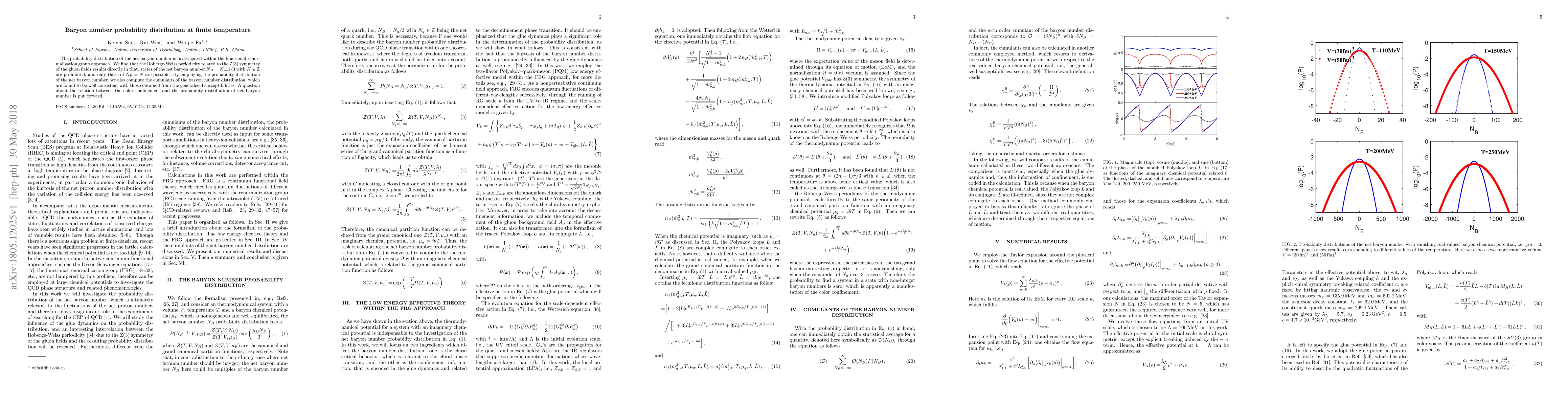 This paper investigates the probability distribution of net baryon number at finite temperature using the functional renormalization group approach, revealing that states with $N_B=N\pm 1/3$ are prohibited due to the Roberge-Weiss periodicity. It also computes baryon number distribution cumulants, finding consistency with generalized susceptibilities, and raises questions about the link between color confinement and baryon number distribution.