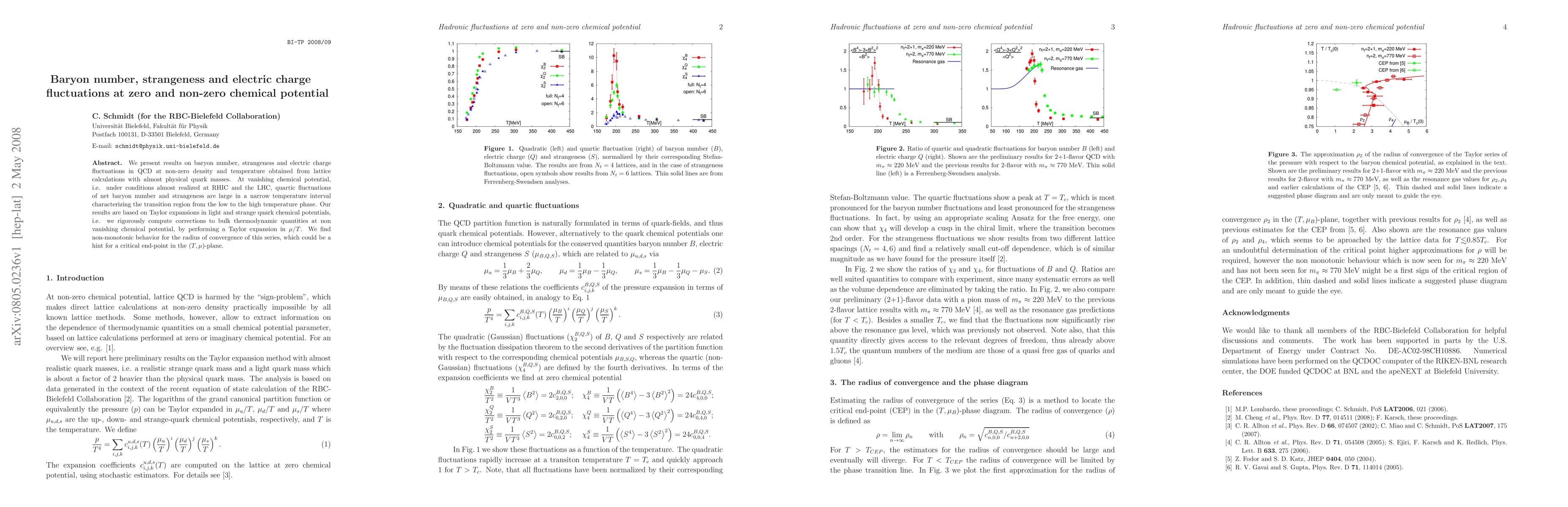 This paper reports on lattice QCD calculations revealing significant fluctuations in baryon number, strangeness, and electric charge at non-zero density and temperature, with a focus on the transition region between low and high temperature phases. It also discusses the potential existence of a critical endpoint in the temperature-chemical potential plane based on non-monotonic convergence radius behavior.