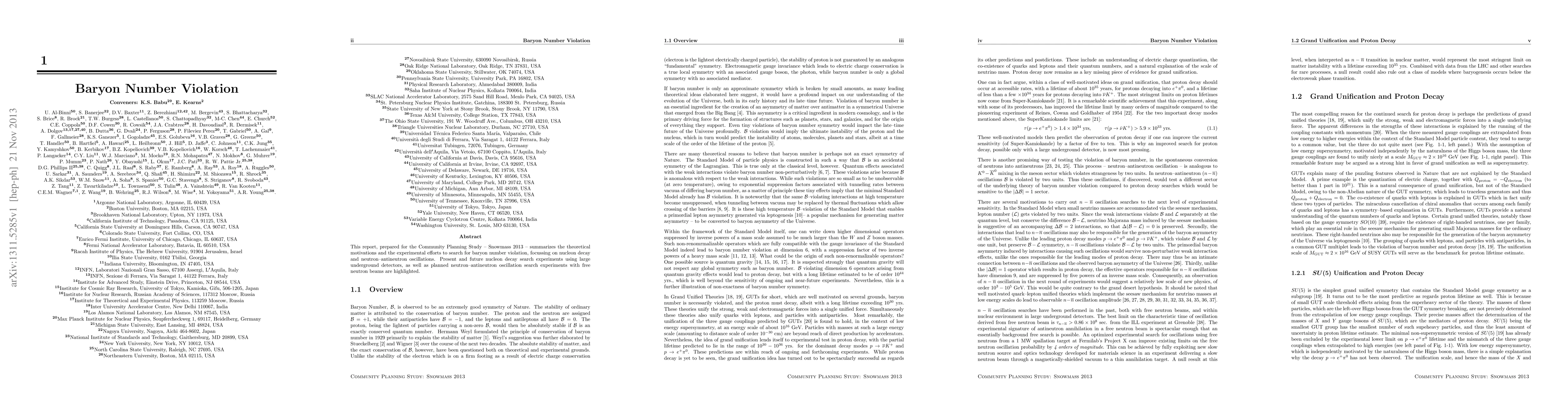 This report reviews theoretical motivations and experimental efforts for detecting baryon number violation, emphasizing nucleon decay and neutron-antineutron oscillations. It highlights current and future large-scale underground detector experiments and planned free neutron beam experiments.