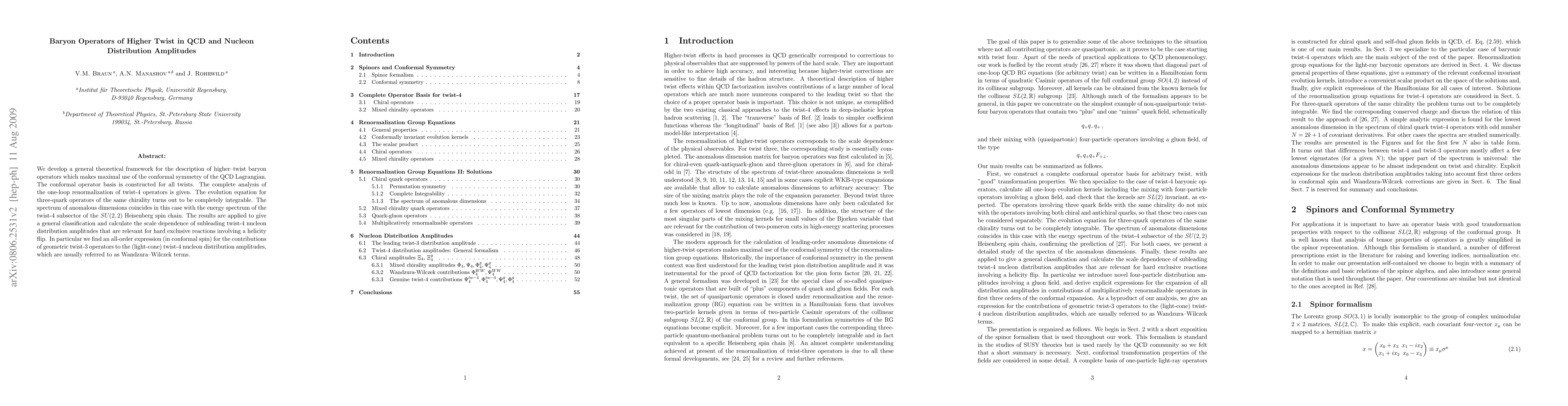 This paper develops a theoretical framework for higher-twist baryon operators in QCD, utilizing conformal symmetry and analyzing one-loop renormalization of twist-4 operators. It provides an all-order expression for geometric twist-3 contributions to twist-4 nucleon distribution amplitudes, relevant for hard exclusive reactions with helicity flips.