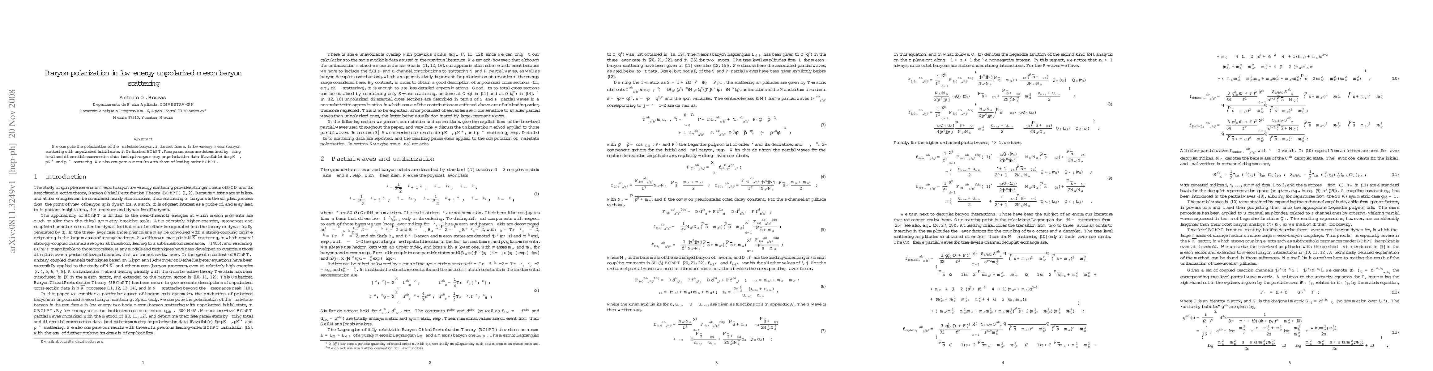We compute the polarization of the final-state baryon, in its rest frame, in low-energy meson--baryon scattering with unpolarized initial state, in Unitarized BChPT. Free parameters are determined by fitting total and differential cross-section data (and spin-asymmetry or polarization data if available) for $pK^-$, $pK^+$ and $p\pi^+$ scattering. We also compare our results with those of leading-order BChPT.
