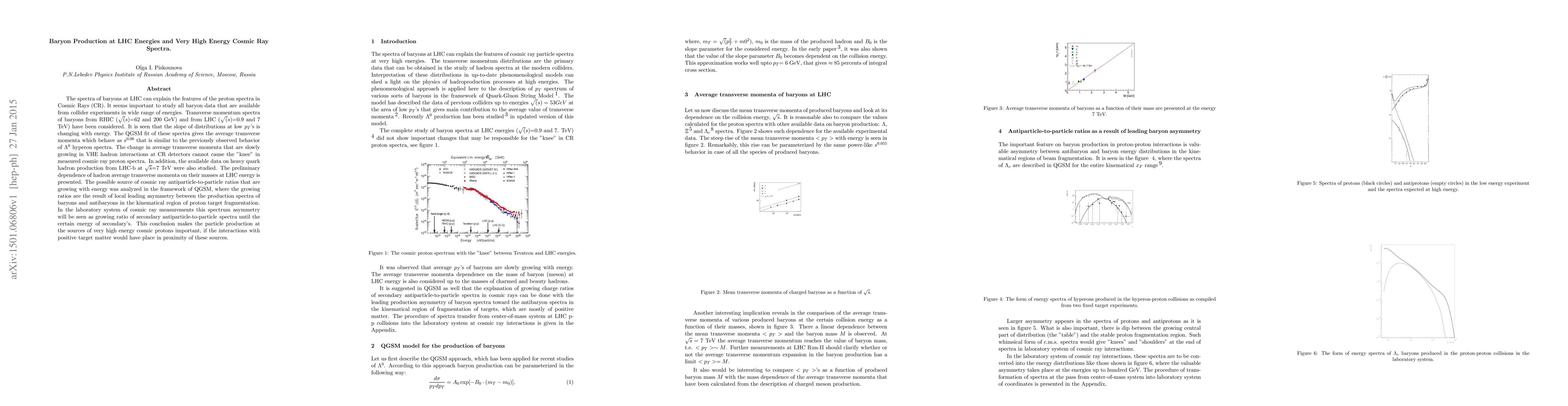 This paper explores how baryon production at LHC energies can explain features in cosmic ray spectra, noting the changing slope of transverse momentum distributions with energy. It concludes that the gradual increase in average transverse momenta in high-energy cosmic ray interactions does not cause the "knee" in cosmic ray proton spectra and discusses the implications for antiparticle-to-particle ratios in cosmic rays.