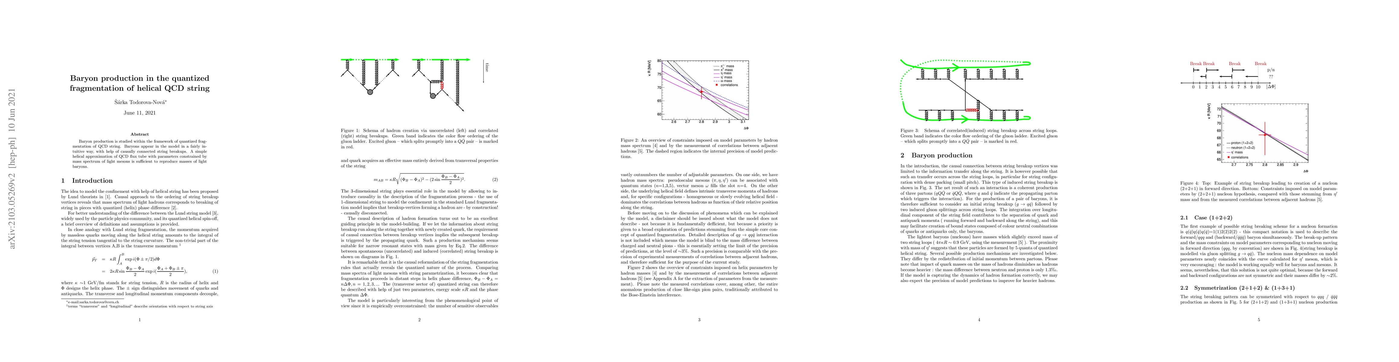 This paper investigates baryon production through the quantized fragmentation of a helical QCD string, showing that baryons naturally emerge from causally connected string breakups. The model uses a helical approximation of the QCD flux tube, constrained by the mass spectrum of light mesons, to reproduce the masses of light baryons.