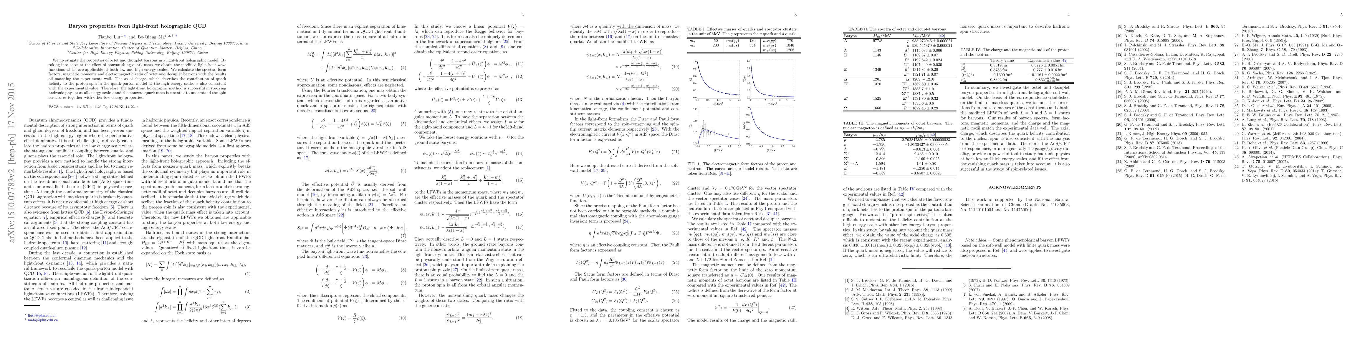 We investigate the properties of octet and decuplet baryons in a light-front holographic model. By taking into account the effect of nonvanishing quark mass, we obtain the modified light-front wave functions which are applicable at both low and high energy scales. We calculate the spectra, form factors, magnetic moments and electromagnetic radii of octet and decuplet baryons with the results all matching the experiments well. The axial charge, which describes the contribution of quark helicity to the proton spin in the quark-parton model at the high energy scale, is also consistent with the experimental value. Therefore, the light-front holographic method is successful in studying hadronic physics at all energy scales, and the nonzero quark mass is essential to understand the spin structures together with other low energy properties.