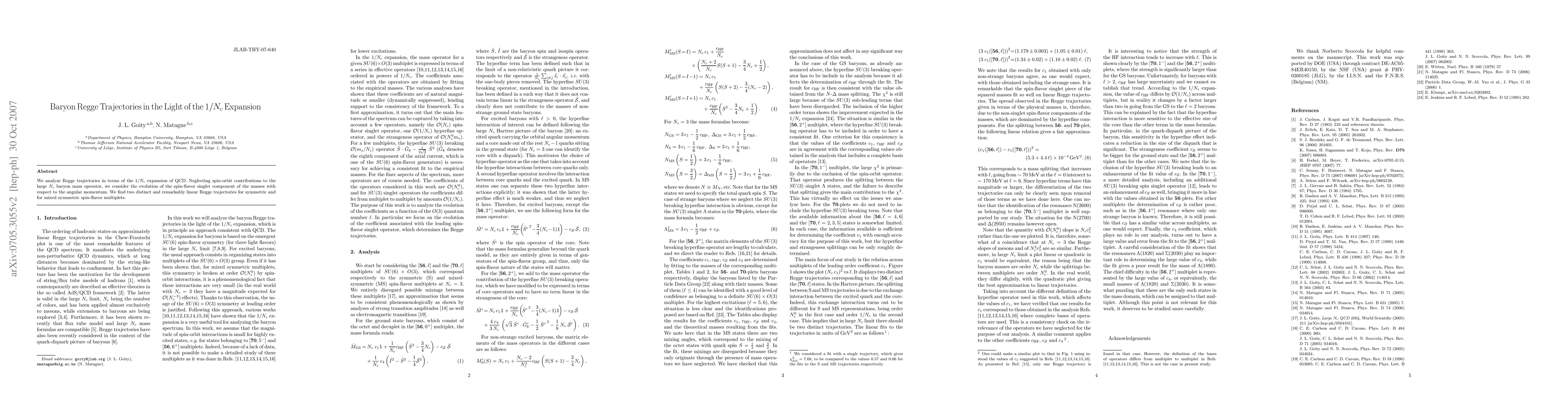 This paper examines the Regge trajectories of baryons using the $1/N_c$ expansion in QCD, revealing two linear trajectories for symmetric and mixed symmetric spin-flavor multiplets, while ignoring spin-orbit contributions.