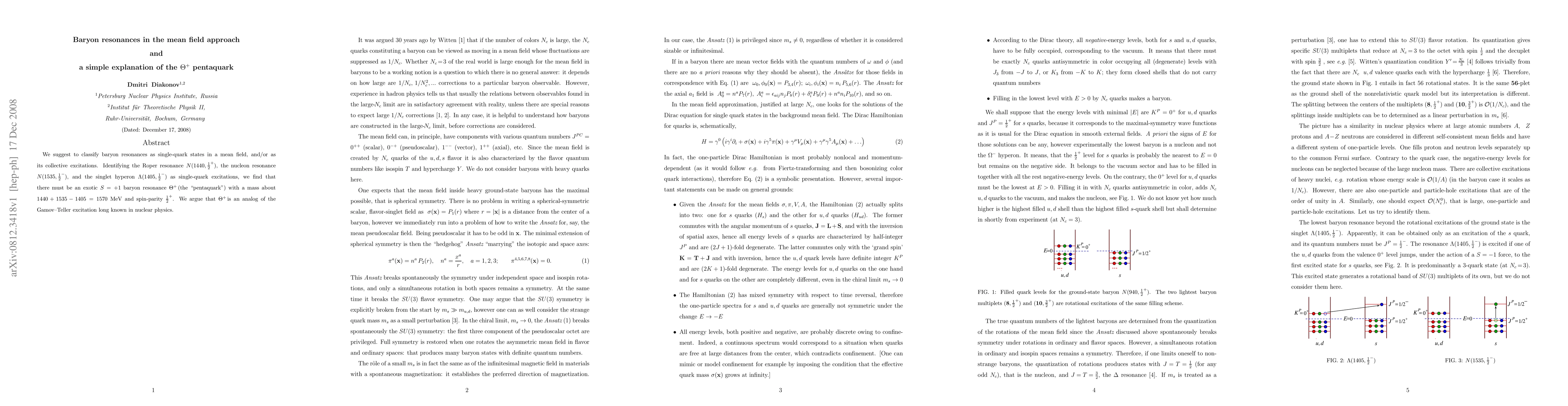 The paper introduces a classification of baryon resonances as single-quark states or collective excitations in a mean field, providing a theoretical framework to predict the existence and properties of exotic particles like the Theta+ pentaquark.