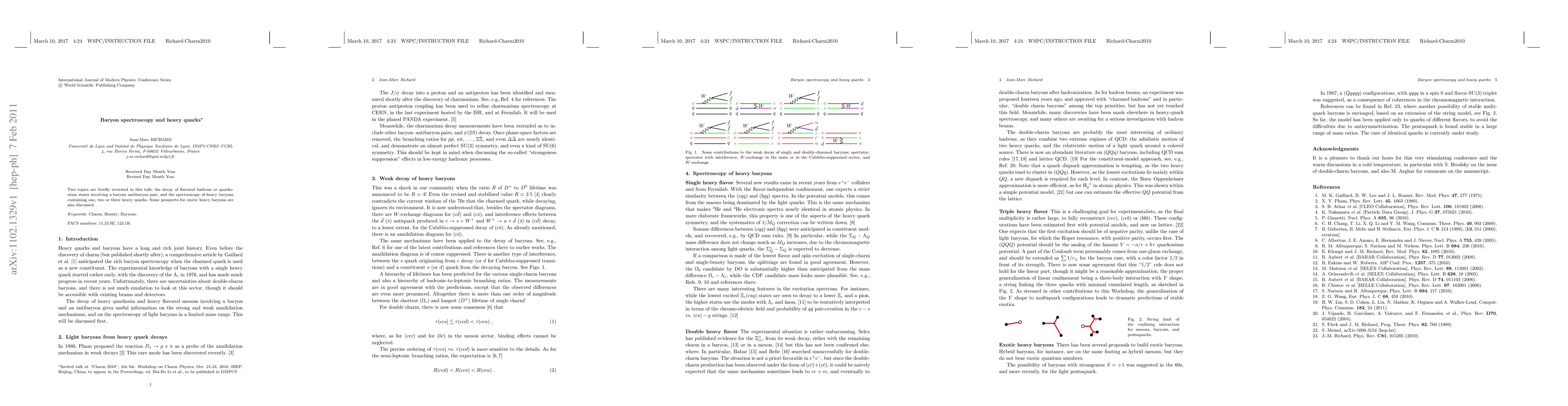 Two topics are briefly reviewed in this talk: the decay of flavored hadrons or quarkonium states involving a baryon--antibaryon pair, and the spectroscopy of heavy baryons containing one, two or three heavy quarks. Some prospects for exotic heavy baryons are also discussed.