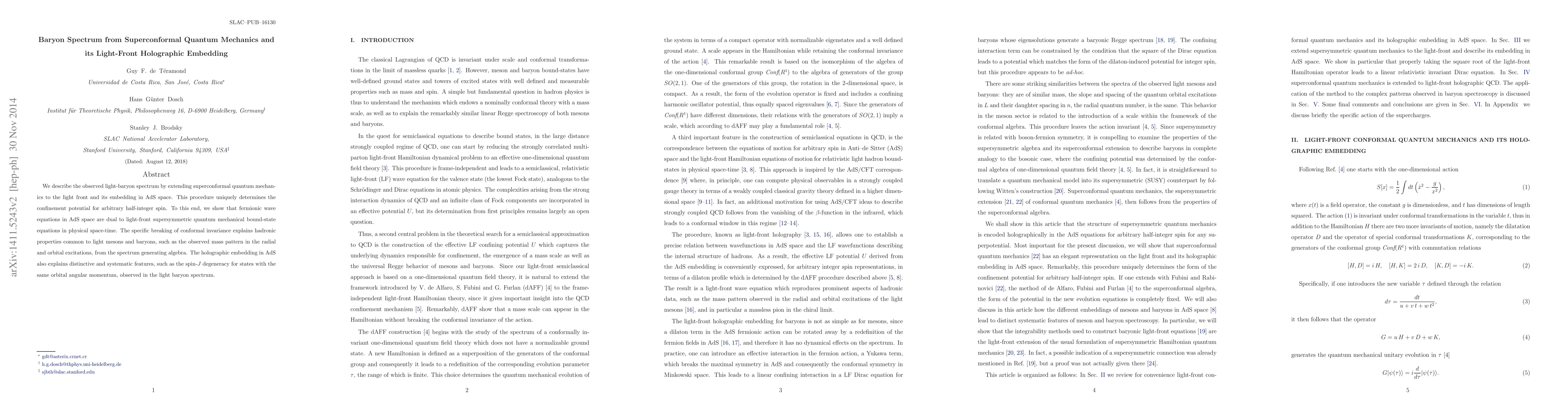This paper extends superconformal quantum mechanics to the light front and embeds it in AdS space to describe the light-baryon spectrum, determining the confinement potential. The study reveals how the breaking of conformal invariance explains common hadronic properties and how the AdS holographic embedding explains observed spin-$J$ degeneracies in light baryons.