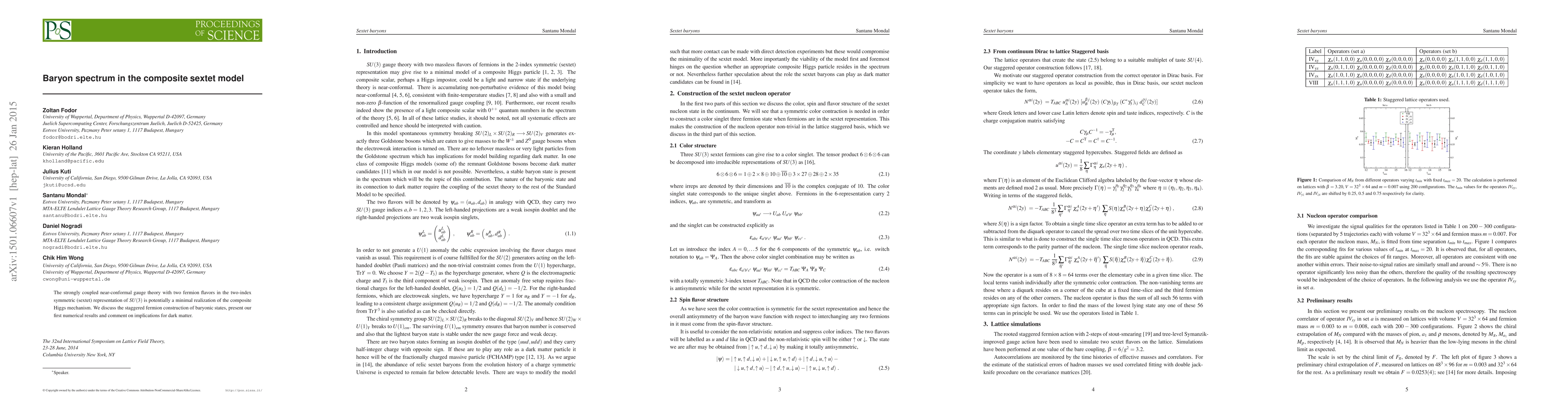 This paper explores a strongly coupled near-conformal gauge theory with two fermion flavors in the sextet representation, proposing a minimal composite Higgs mechanism. It presents initial numerical results on baryonic states constructed via staggered fermions and discusses potential implications for dark matter.