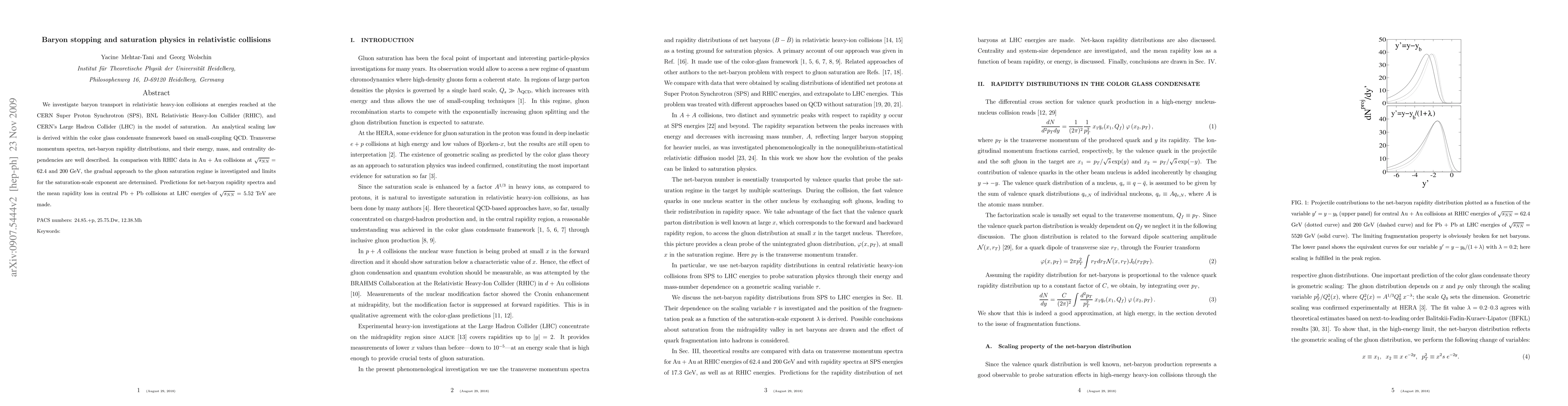 This paper explores baryon transport in relativistic heavy-ion collisions using a saturation model, deriving an analytical scaling law within the color glass condensate framework. It successfully describes transverse momentum spectra and net-baryon rapidity distributions, and provides predictions for net-baryon rapidity spectra in central Pb + Pb collisions at LHC energies.