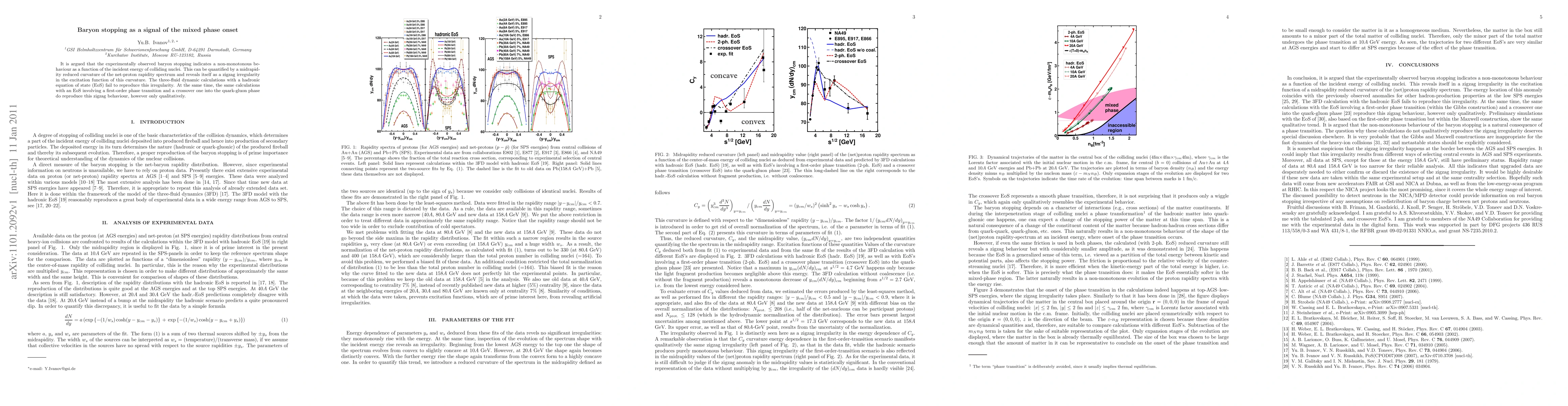 It is argued that the experimentally observed baryon stopping indicates a non-monotonous behaviour as a function of the incident energy of colliding nuclei. This can be quantified by a midrapidity reduced curvature of the net-proton rapidity spectrum and reveals itself as a zigzag irregularity in the excitation function of this curvature. The three-fluid dynamic calculations with a hadronic equation of state (EoS) fail to reproduce this irregularity. At the same time, the same calculations with an EoS involving a first-order phase transition and a crossover one into the quark-gluon phase do reproduce this zigzag behaviour, however only qualitatively.