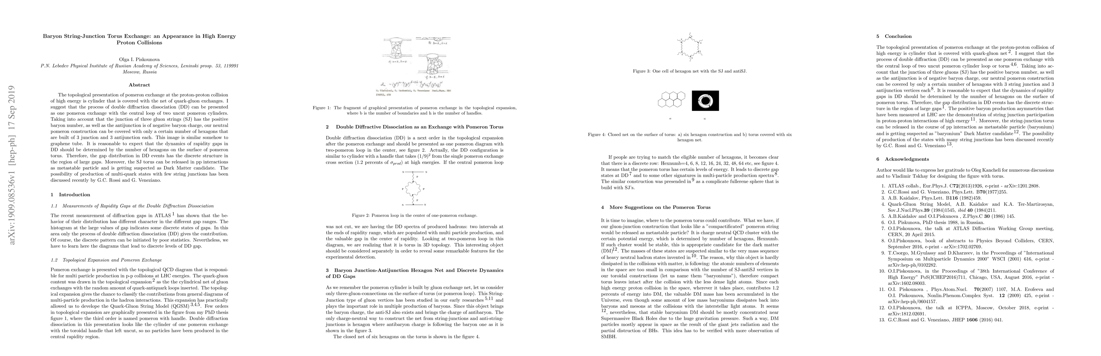 The topological presentation of pomeron exchange at the proton-proton collision of high energy is cylinder that is covered with the net of quark-gluon exchanges. I suggest that the process of double diffraction dissociation (DD) can be presented as one pomeron exchange with the central loop of two uncut pomeron cylinders. Taking into account that the junction of three gluon strings (SJ) has the positive baryon number, as well as the antijunction is of negative baryon charge, our neutral pomeron torus can be covered with only a certain number of hexagons that are built of 3 junction and 3 antijunction each. This image is similar somehow to graphene tube. It is reasonable to expect that the dynamics of rapidity gaps in DD should be determined by the number of hexagons on the surface of pomeron torus. Therefore, the gap distribution in DD events has the discrete structure in the region of large gaps. Moreover, the SJ torus can be released in pp interactions as metastable particle and is getting suspected as Dark Matter candidate. The possibility of production of multi-quark states with few string junctions has been discussed recently by G.C. Rossi and G. Veneziano.