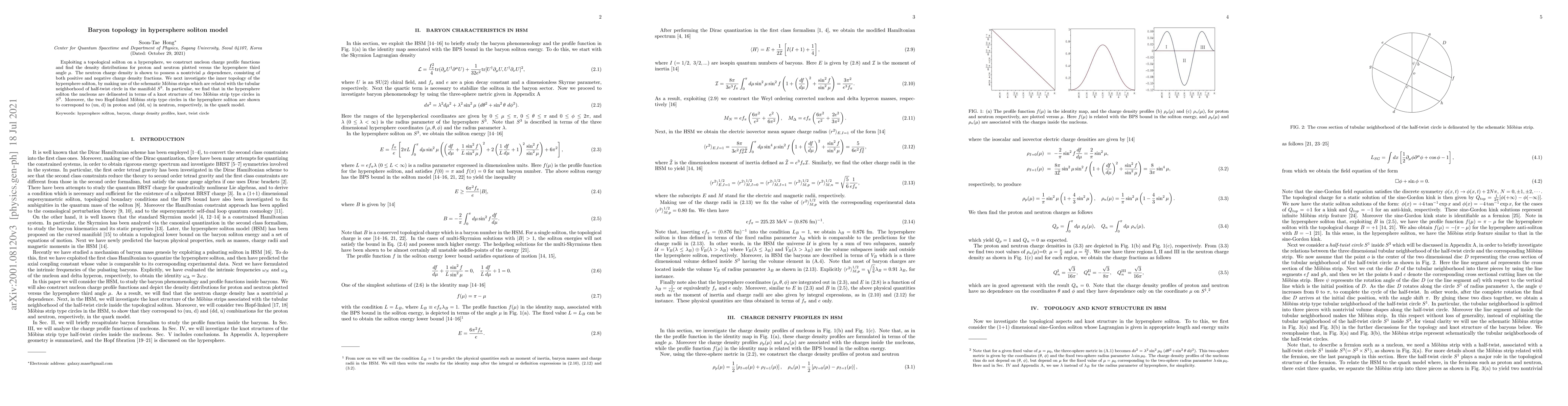 This paper uses a hypersphere soliton model to study baryon topology and finds that nucleons are connected by a knot structure of M"obius strip-type circles, with different configurations for protons and neutrons.