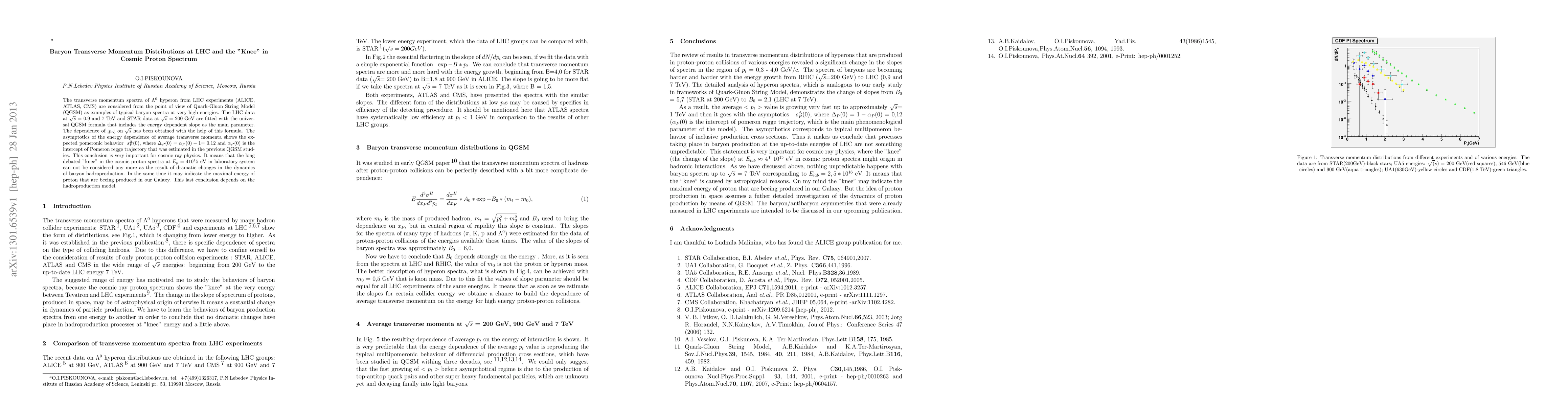 This paper uses the Quark-Gluon String Model to analyze baryon transverse momentum distributions from LHC and STAR experiments, finding a universal energy dependence that explains the "knee" in cosmic proton spectra without requiring dramatic changes in production dynamics. The results suggest the "knee" may indicate the maximum energy of protons produced in our Galaxy.